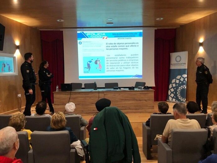 Miembros de la Policía Nacional de Rota han ofrecido esta mañana a los usuarios del programa 'Vida Activa' una charla informativa sobre seguridad, que se ha desarrollado bajo el título de 'El plan de seguridad del mayor', a través de la cual, se pretende que las personas maduras puedan tener información suficiente sobre cómo actuar en algunos casos en los que vean peligrar su integridad física o puedan ser víctimas de posibles estafas.
