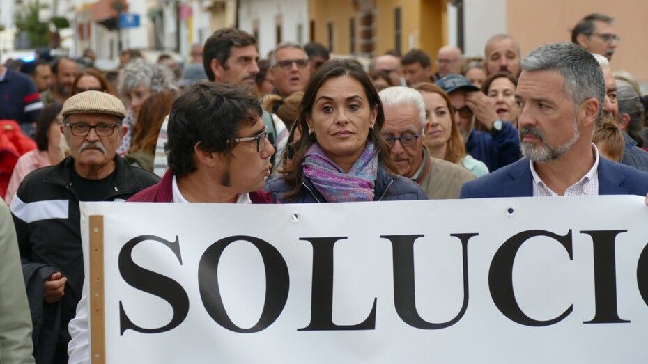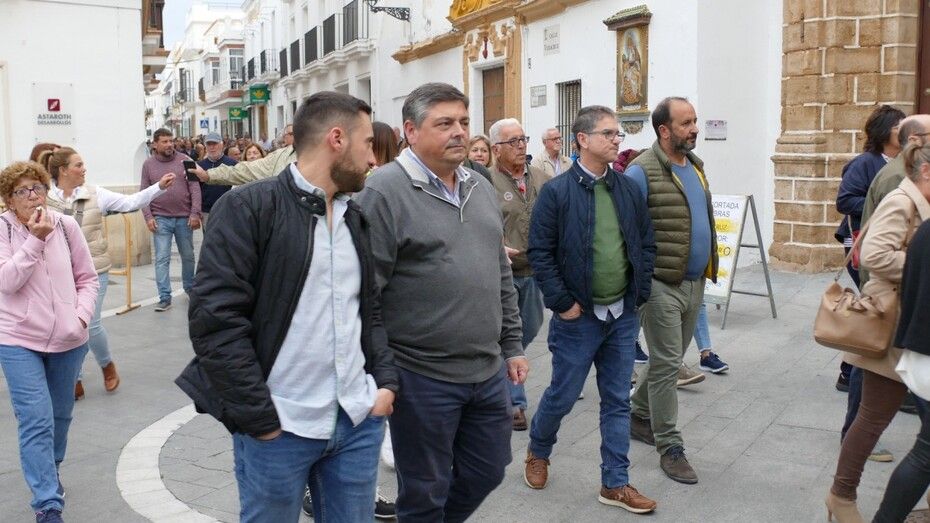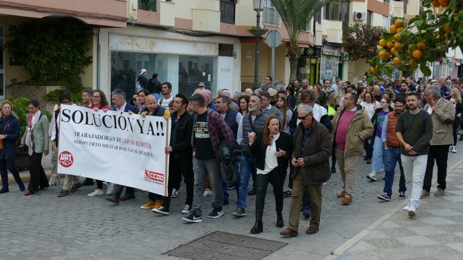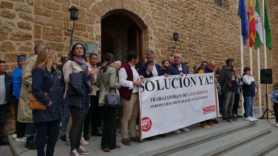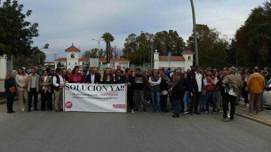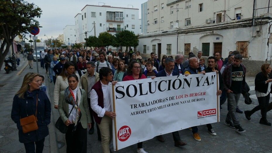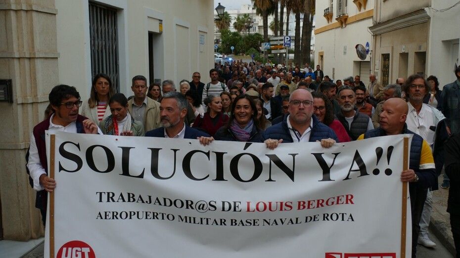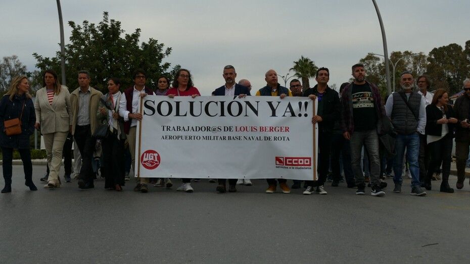Delante, solo una pancarta de cabecera en la que iban trabajadores, miembros del comité y representantes políticos de la Corporación municipal con el alcalde de Rota, Javier Ruiz Arana, a la cabeza y algún representante provincial de Izquierda Unida, en la que se leía "Solución ya. Trabajadores de Louis Berger, aeropuerto militar de la Base Naval de Rota".