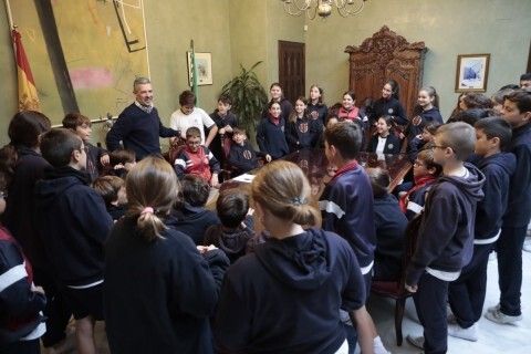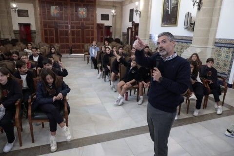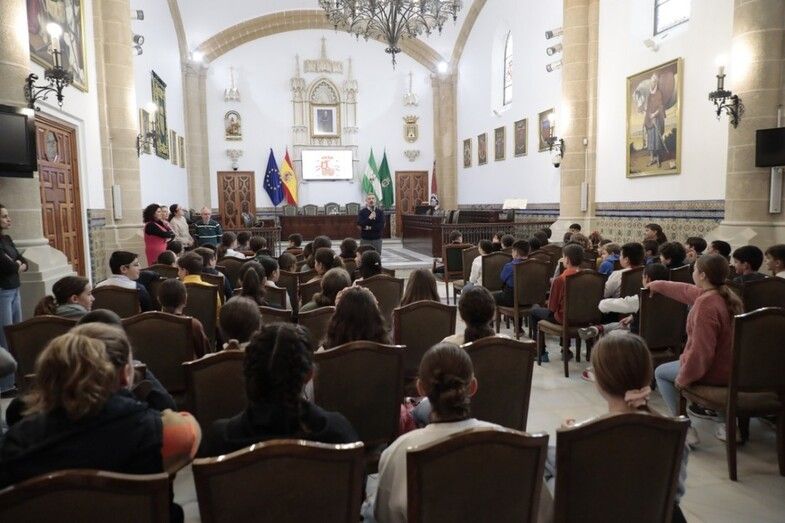 El salón capitular, donde se celebran los plenos municipales, ha sido el lugar elegido para esta actividad en la que el primer edil, acompañado por la delegada de Educación, Laura Almisas, ha explicado de primera mano al alumnado algunas de las principales claves de la Constitución o cómo se elige a los representantes públicos, entre otras cuestiones.