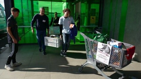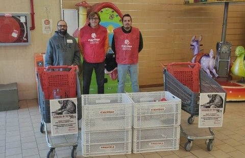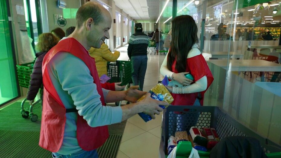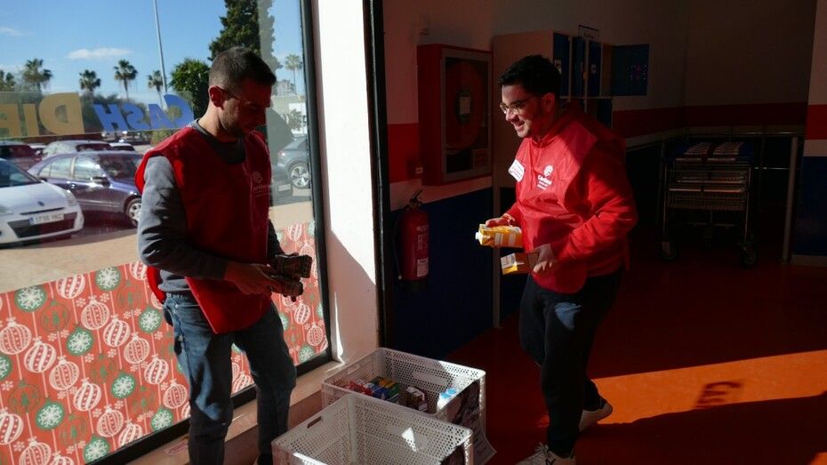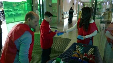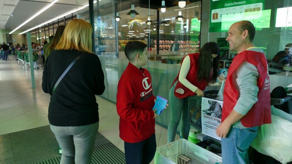 Unos 200 voluntarios repartidos por una docena de supermercados de la localidad, están a las puertas de los establecimientos recogiendo de los ciudadanos las aportaciones que cada uno, en la medida de sus posibilidades, puede donar.