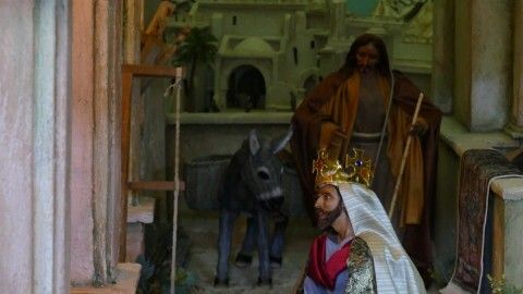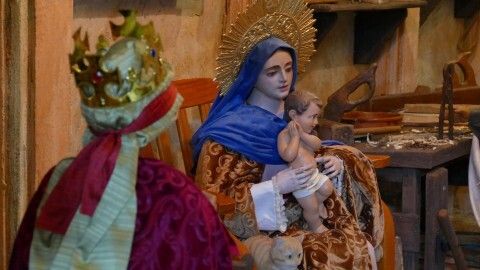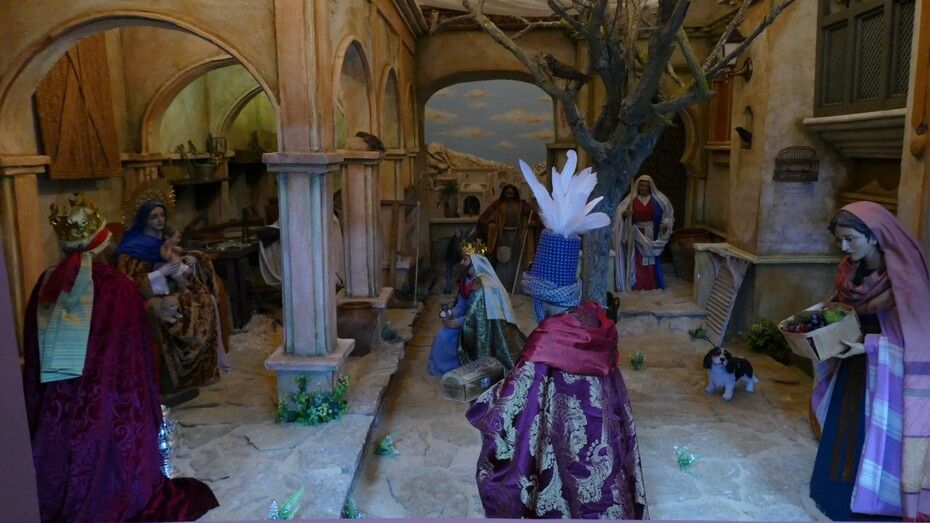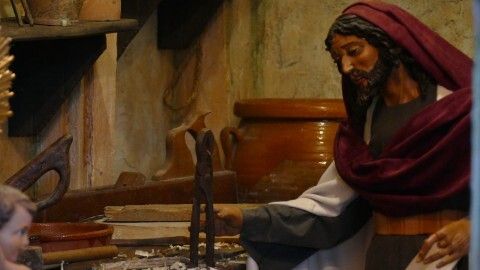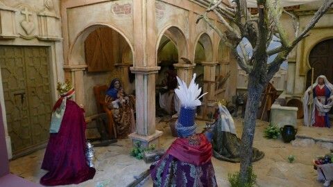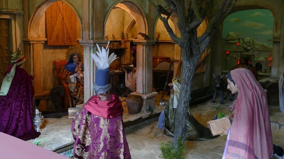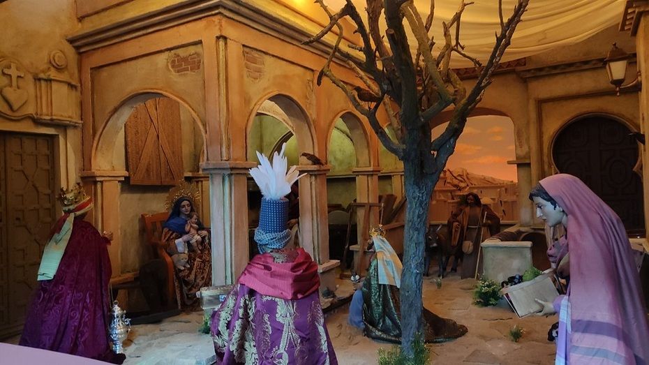 El nacimiento de Jesús en el belén de la Hermandad de los Dolores se recrea este año bajo un porticado en el que se puede ver a José trabajando en su carpintería, mientras los Reyes Magos adoran al niño Jesús allí mismo. En el entorno, una plaza con otros personajes y algún animalillo. Para realzar el ambiente, suena la música de fondo, que se estrena con un nuevo sistema de música que han utilizado, y se puede ver el cambio de iluminación que permite disfrutar del belén de día y de noche. Es una parada obligada esta Navidad.