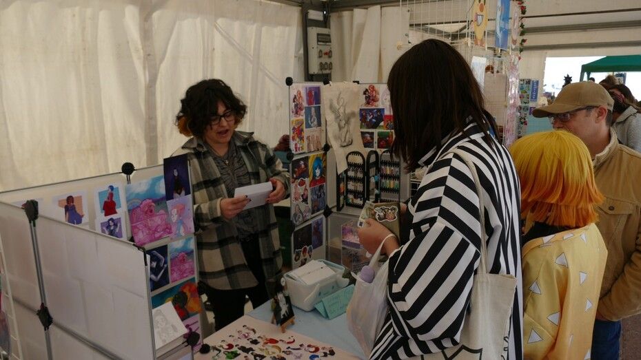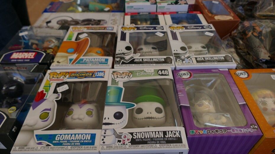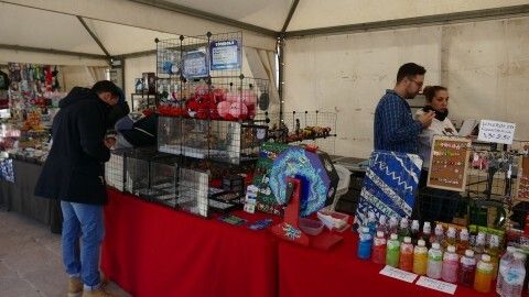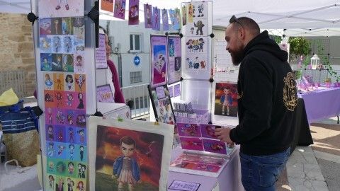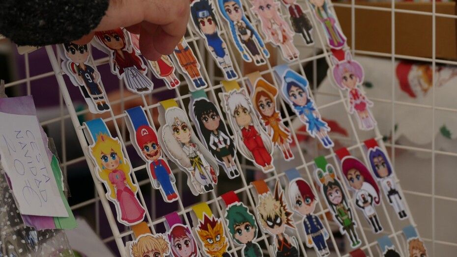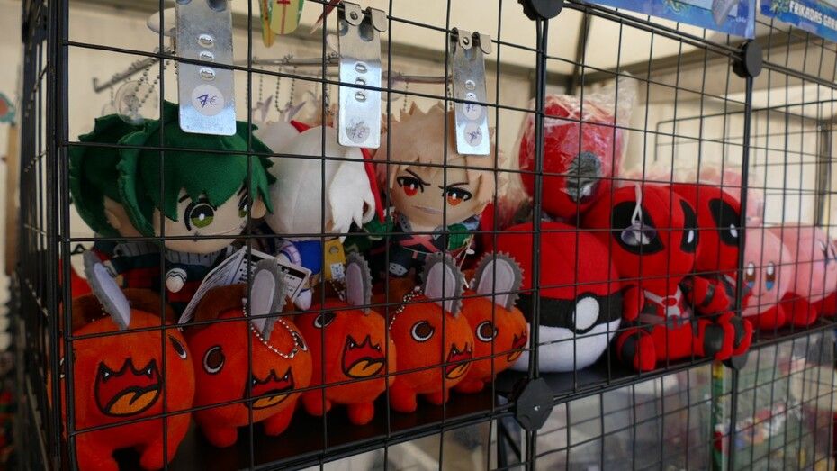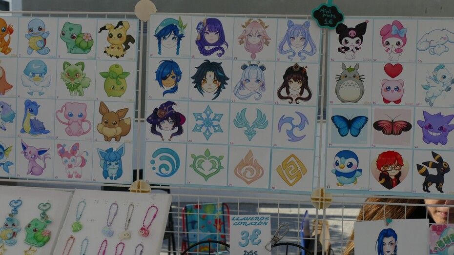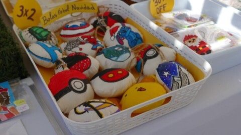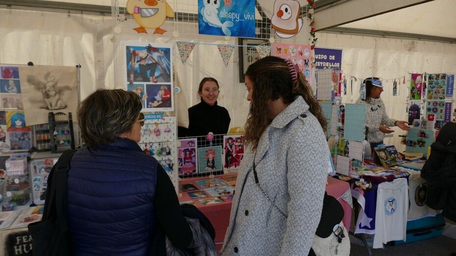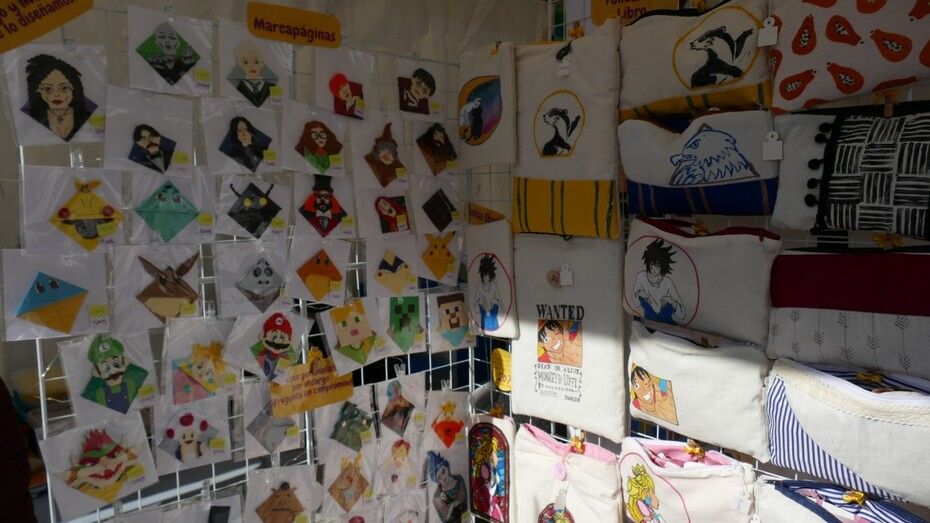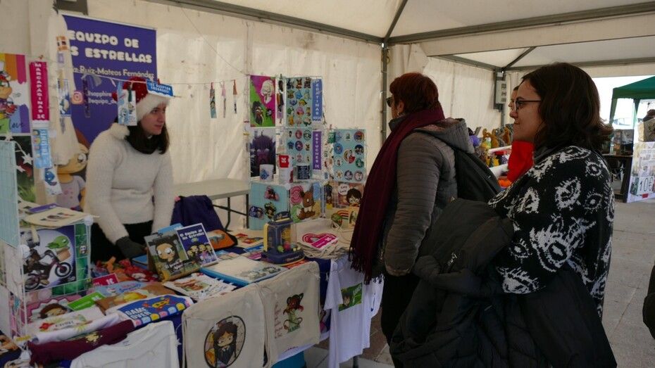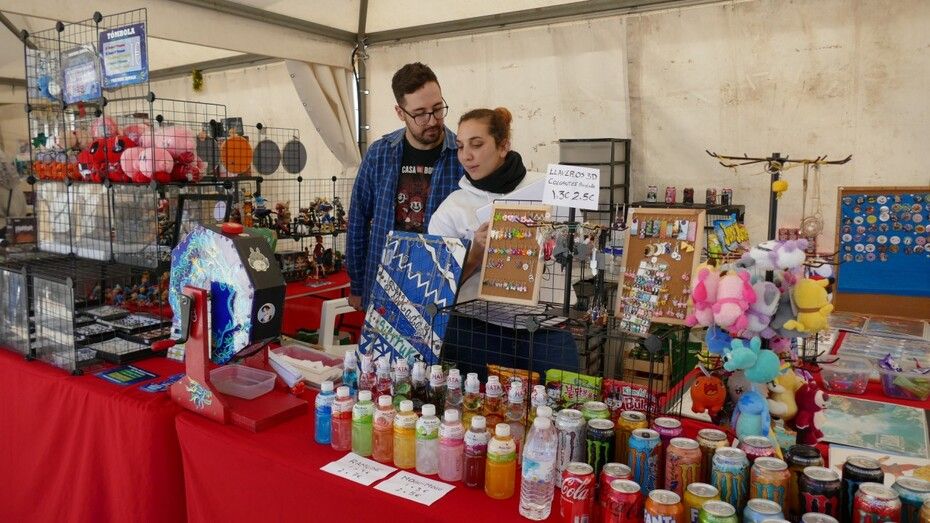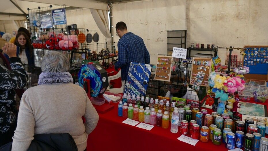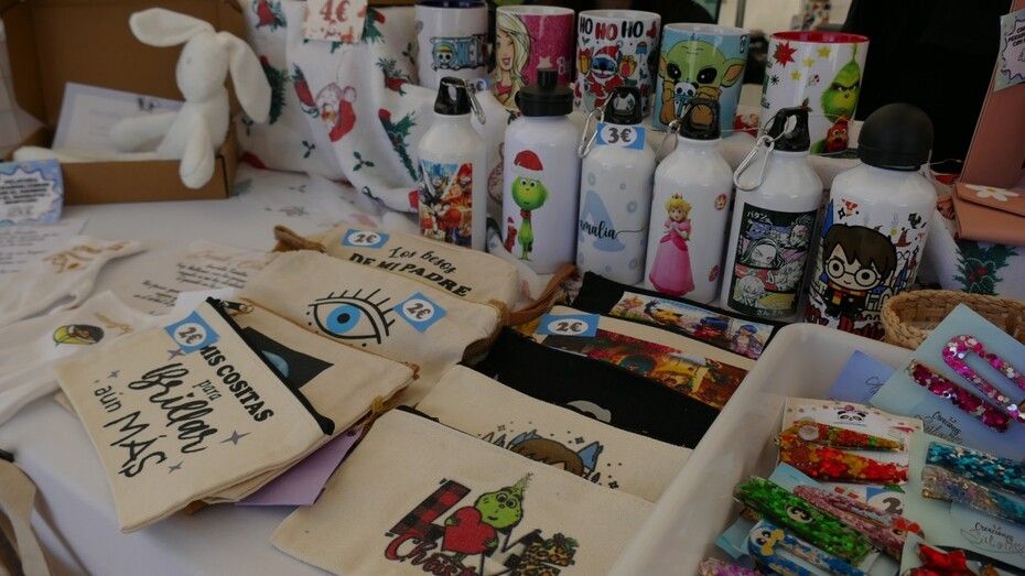En torno a una quincena de expositores están abiertos con peluches, tazas, camisetas, llaveros, marcapáginas personalizados o con los personajes de moda más destacados, ilustraciones, pegatinas, posters, bisutería, libretas, chapas, figuras decorativas, cuentos, bolsas de tela pintadas, estuches, bolas muy frikis para el árbol de Navidad, miniaturas, funko pop, etc. Una amplia variedad de artículos y productos que se puede encontrar y comprar en este mercadillo que tiene un fin solidario ya que colabora con 'Infancia solidaria'.