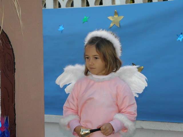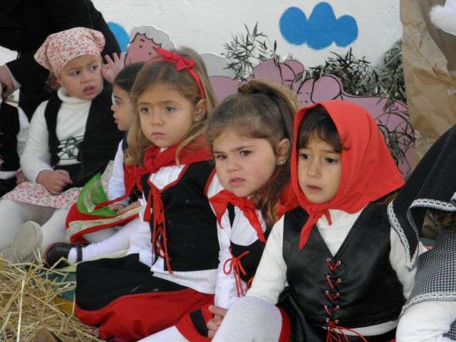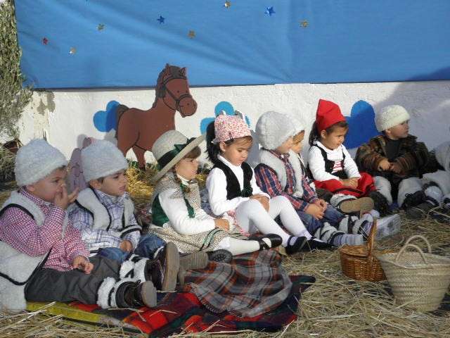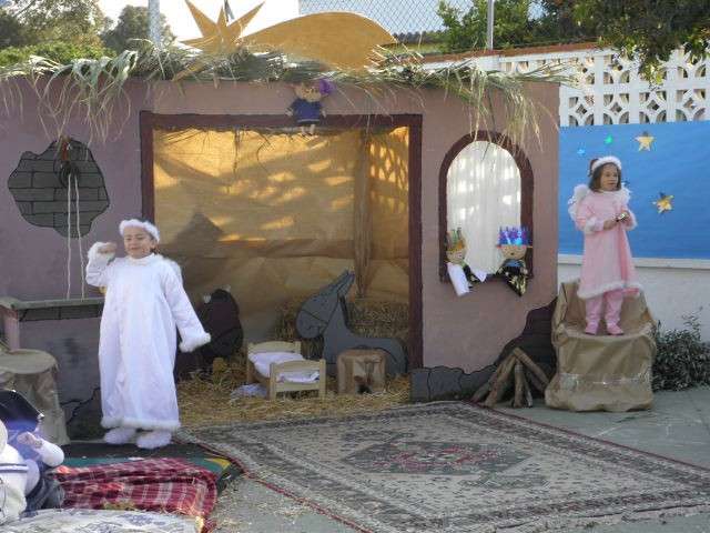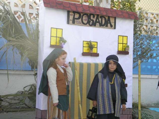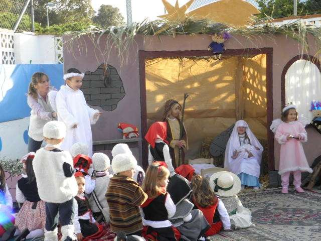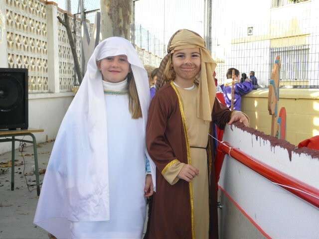 Buena muestra de ello ha sido esta mañana el colegio Azorín donde niños de 3, 4 y 5 años han representado un belén viviente al que no le ha faltado un detalle. Para ello, el patio de los pequeños se ha convertido en algo parecido a lo que debió ser Belén cuando María y José llegaron buscando posada para dar a luz al niño Dios. Así lo han querido escenificar los casi cien pequeños que, ataviados perfectamente para representar a las figuras más populares de un belén, han sorprendido al público asistente con una puesta en escena digna de ser recnocida.