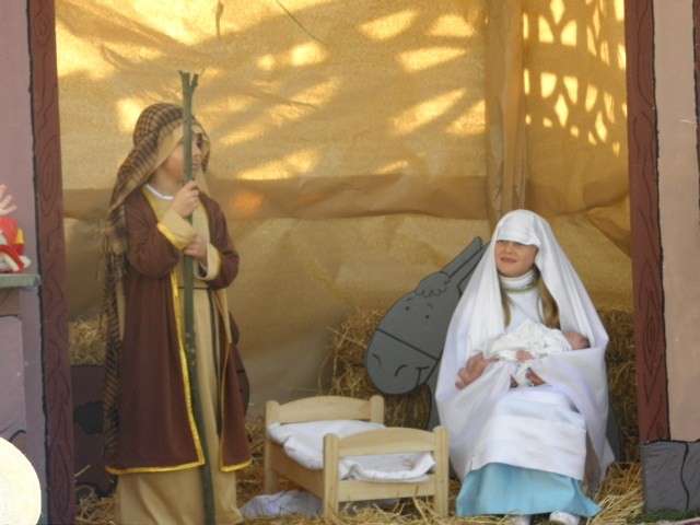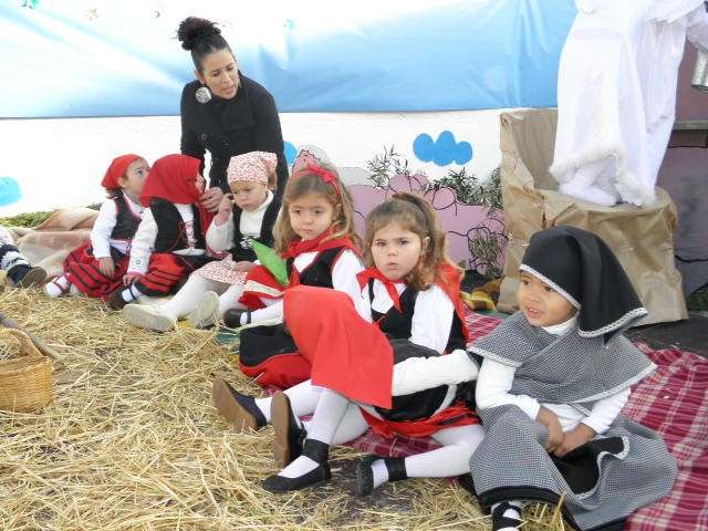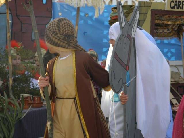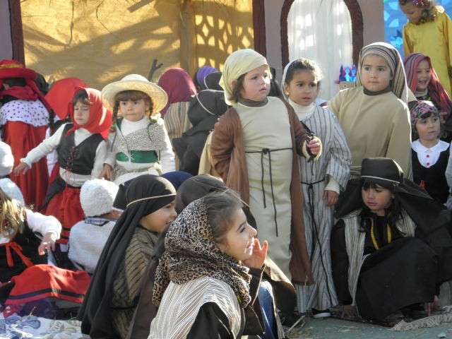 Han sido dos semanas de trabajo en clases aprendiendo villancicos y entonando las canciones más populares que hoy han cantado dando vida a una historia ya conocida en esta época. Y es que los profesores del ciclo de Infantil han querido dar una vuelta de tuerca a las representaciones navideñas y este año han apostado por algo distinto. Contar la historia del nacimiento de Jesús sin dejar detalle desde que María y José llegaron a Belén, buscaron posada, no la encontraron, siguieron por puestos y casas buscando lugar para cobijarse y finalmente, acabaron en el pesebre en el que María dio a luz, ha sido el eje de este belén viviente que ha dejado embobado a padres y familiares. Una historia que, como mandan los cánones, ha concluido con la llegada de los reyes magos y la posterior adoración de todos los vecinos de Belén. Entre ellos se encontraban pastoras, vendedoras de tela, de cueros, carpinteros, puestos de cerámica, de mimbres, panaderas, soldados, lavanderas y fruteras que han ido entonando, al ritmo que marcaba la historia, los villancicos más populares de la Navidad. Durante los 20 minutos que aproximadamente ha durado la representación, no había cámara de foto o vídeo que no estuviera inmortalizando este momento en el que los pequeños han sido protagonistas de una historia que a los mayores ya les suena pero que contada así, devuelve la magia de esta época.