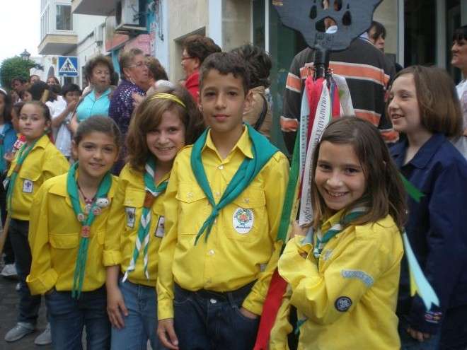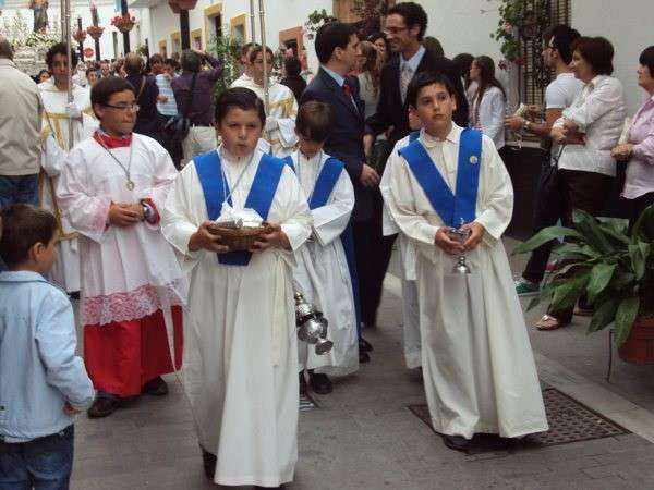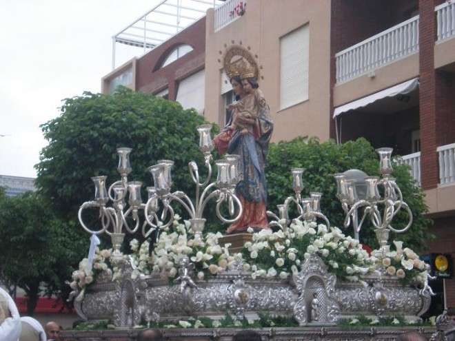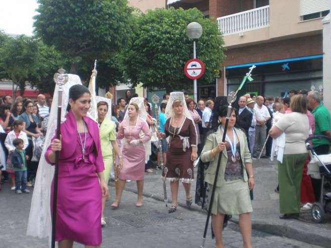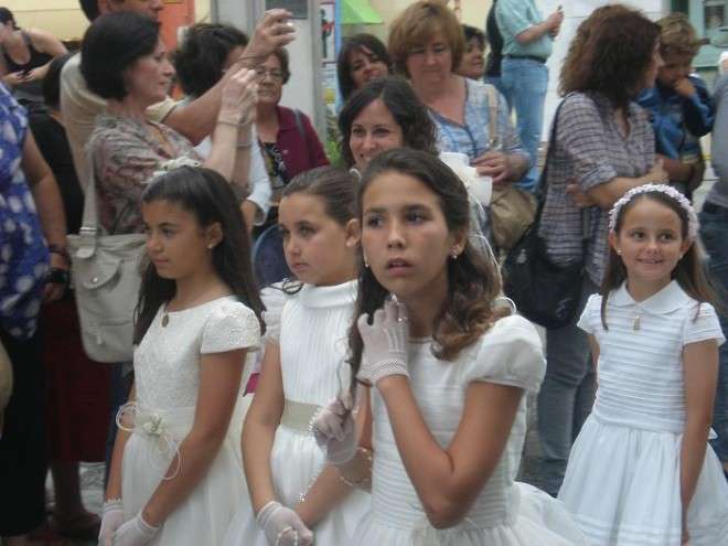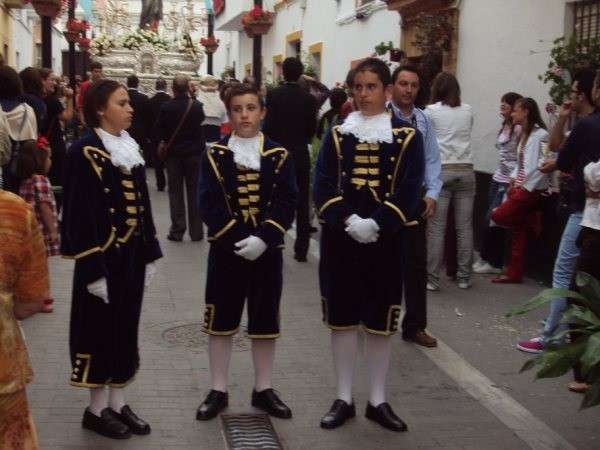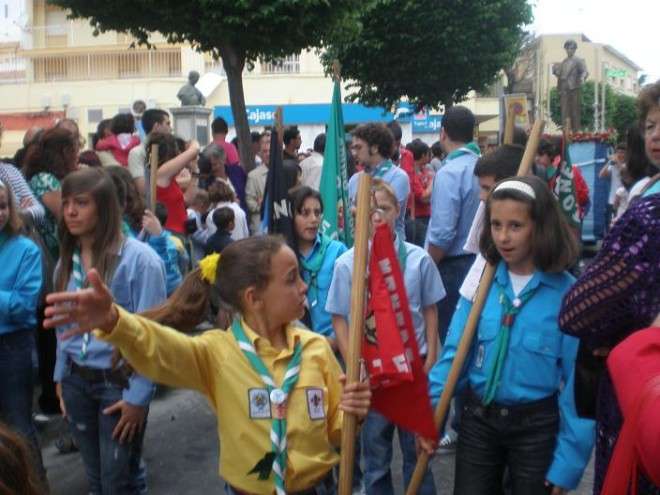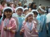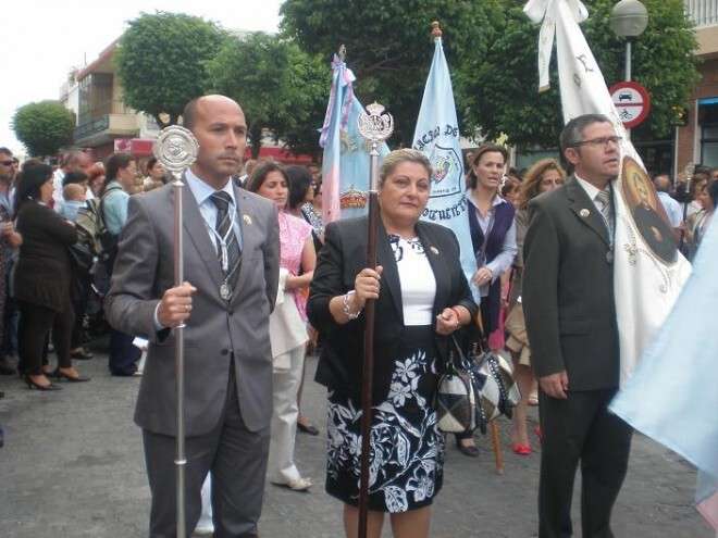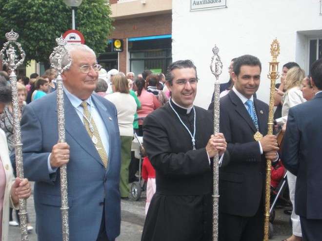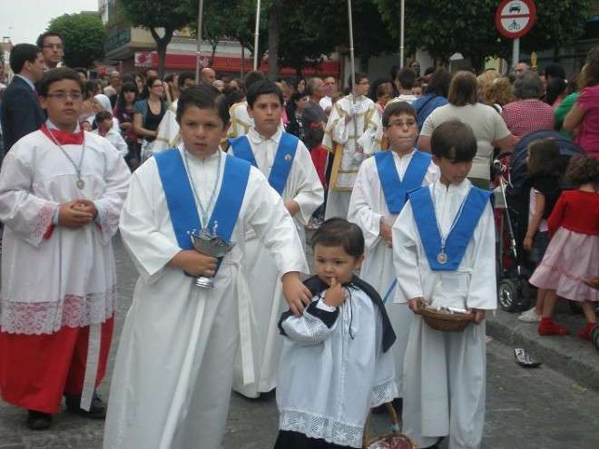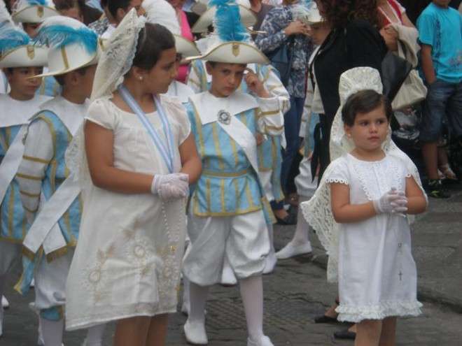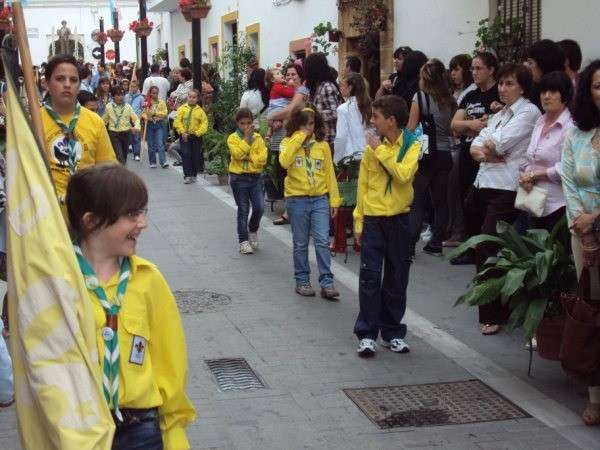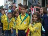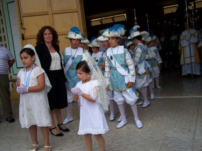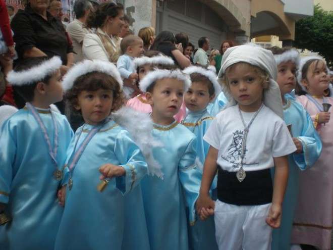 El cortejo lo abrían los pequeños angelitos de los cursos de Infantil y primer ciclo de Primaria de los Salesianos, que haciendo sonar campanitas iban alertando de la llegada de la Virgen por las calles del municipio. En esta misma comitiva se encontraban los niños que este año han recibido su Primera Comunión, también estaban los integrantes del grupo de scouts Santo Domingo Savio, la Archicofradía de Maria Axiliadora del colegio Slesiano, los jóvenes del Movimiento Juvenil Salesiano, antiguos aumnos, una representación de la Asociación de María Auxiliadora de las Salesianas, la junta del AMPA del colegio, el Centro Juvenil Rábeta, la Asociación de Madres Mamá Margarita, profesores , alumnos y mujeres vestidas con la tradicional mantilla española que dieron la nota de color a este largo cortejo.