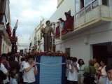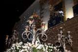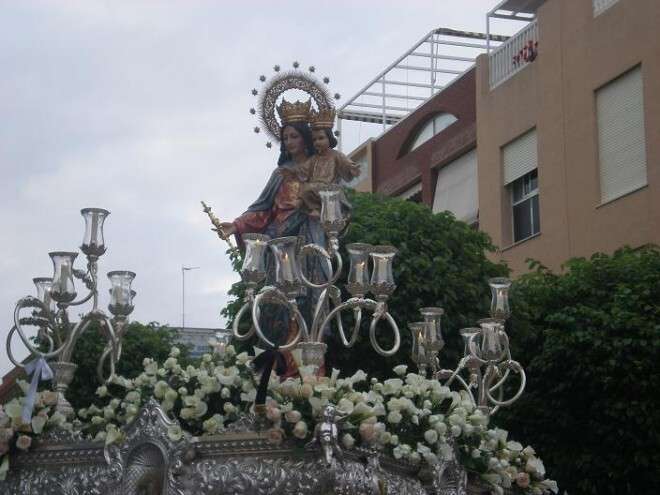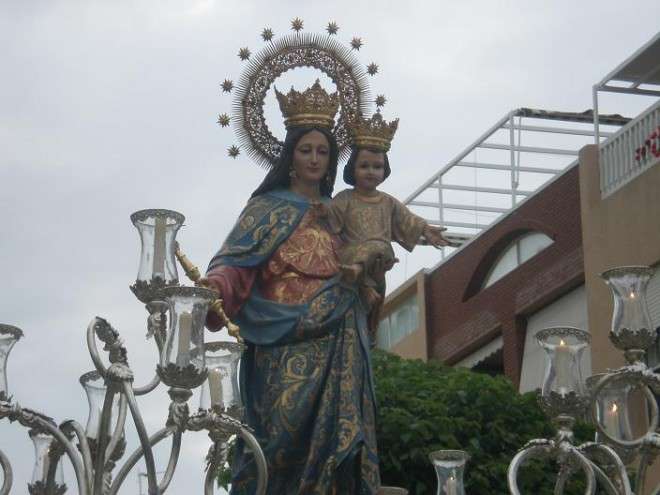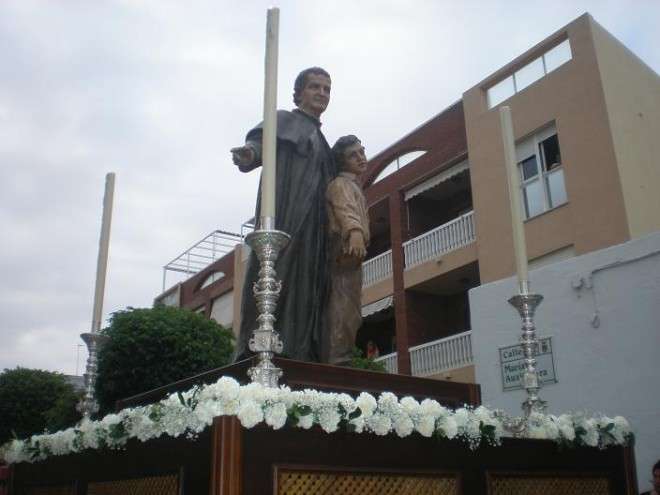 Ayer, puntualmente a las siete y media de la tarde, María Auxiliadora salía del patio del colegio de Nuestra Señora del Rosario tras haberse celebrado una solemne eucaristía. Como ocurre desde hace algunos años, la Virgen no procesionaba sola, la acompañaban las figuras de Santo Domingo Savio y de San Juan Bosco que portadas por jóvenes costaleros iban abriendo paso a María.