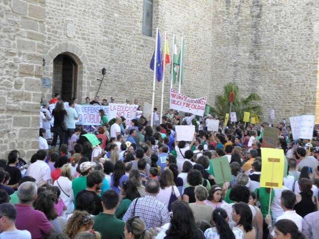 Una vez posicionados, haciendo mucho ruido, con pitos, cacerolas y hasta una batukada, se iniciaba la lectura de tres manifiestos que recogían tres visiones diferentes de los recortes, y que se unían en una apuesta por la defensa de la educación. Antes de iniciarse esta parte final del acto,  concejales del equipo de gobierno del Partido Popular y Roteños Unidos bajaron a las puertas del Castillo de Luna y escucharon en primera persona las reivindiaciones de una comunidad educativa que ayer dijo no a los recortes y sí a una educación digna. A ellos se sumaron los otros dos partidos de la Corporación municipal, PSOE e Izquierda Unida, que participaron de forma activa en la manifestación. Todos, recibieron una copia de la propuesta que la Plataforma en Defensa de la Escuela Pública ha elaborado con el fin de que en el pleno municipal se debata esta cuestión sobre los recortes en eduación y el resultado de la votación de la misma se eleve tanto a la Junta de Andalucía como al Congreso de los Diputados para que ambos órganos tengan conocimiento. Los representantes políticos cogieron una copia de esa propuesta y habrá que esperar a su debate en la sesión plenaria y al resultado de esa votación por parte de la Corporación municipal.