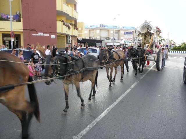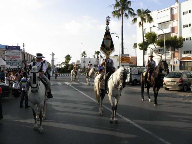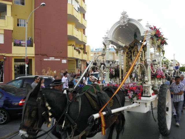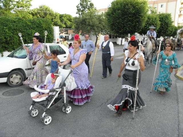 Con caras cansadas aunque con la satisfacción de haber podido disfrutar un año más del reencuentro con la Blanca Paloma, los rocieros fueron saludando a muchos de sus conocidos a los que entregaron algo del romero del camino. Los hermanos rocieros, a caballo, andando, portando insignias y varas de la hermandad o subidos en sus coches, fueron desfilando por las calles de la localidad hasta llegar a la parroquia del Carmen donde sobre las nueve de la noche, se celebraba una misa para dar gracias a la virgen.