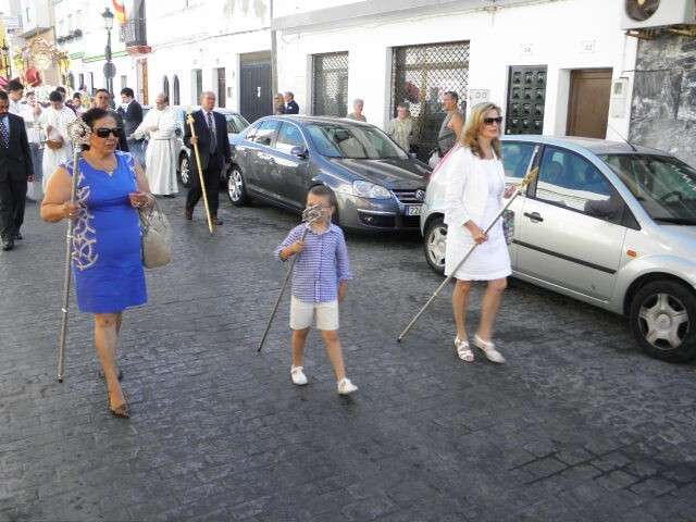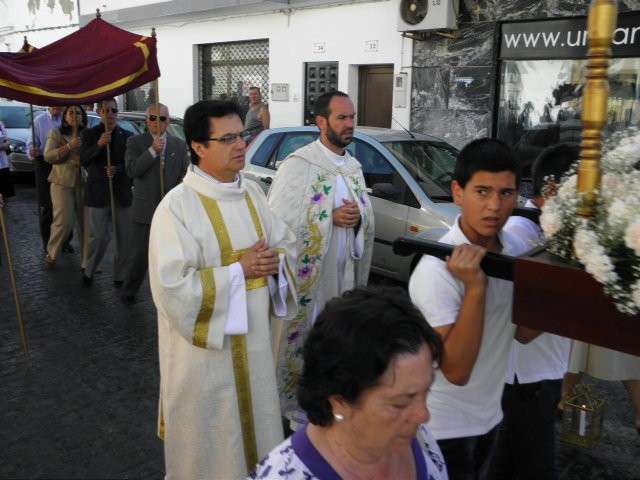 Portada por jóvenes cofrades de la localidad, en un parihuela que es el paso de Santa Gema Galgani, titular de la Hermandad del Cristo del Amor, el Corpus Chico ha bajado la calle Calvario para tomar la cuesta de San Cayetano, pasar por el arco con el mismo nombre, y recorrer las calles Buenavista, López de Vega, San Antonio y de vuelta a la capilla por Calvario.