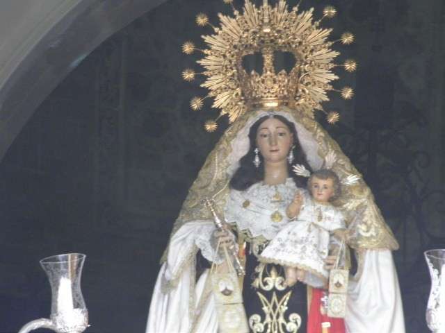 Nuestra Señora del Carmen lucía como lo hace desde 1997 el fajín rojo donado por el almirante don Jaime Cervera, además de una toca de sobremanto realizada en los talleres Olioz en 2004. Ayer estrenaba una media luna colocada delante de su peana que se suma a los diez candeleros que se han estrenado durante los cultos internos que ha celebrado en estos días la hermandad.