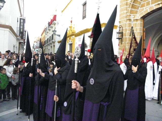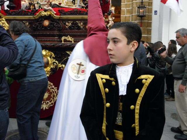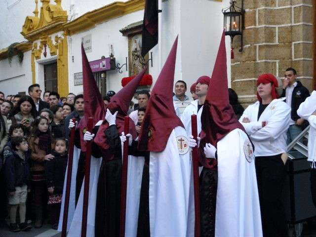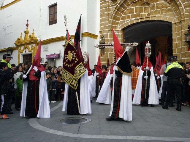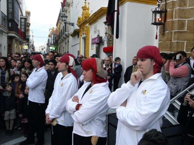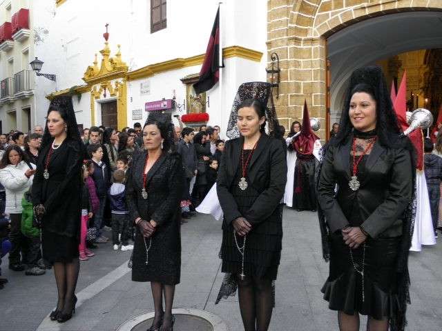 La Hermandad de los Dolores coincide con el primer día festivo para aquellos que no disfrutan de vacaciones en esta época del año, lo que hace que sea siempre una cofradía muy seguida además de haberse ganado con los años el cariño y devoción de muchos. Con unos 200 hermanos luciendo la túnica negra con botonadura roja y cíngulo ceñido color carmesí, antifaz rojo carmesí y capa blanca arropando a sus titulares, le seguía una representación de nazarenos de la Hermandad de la Salud con la que comparte sede canónica. Entre todas sus insignias, calificadas como uno de los mejores tesoros cofradieros de la localidad, han estado presentes también las mujeres vestidas de riguroso negro luciendo la tradicional mantilla española. Junto a ellas, el cuerpo de acólitos de Cádiz.