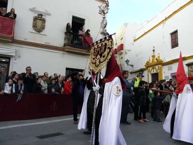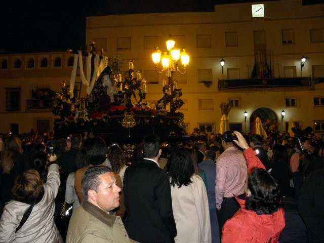 Sobre las siete y media de la tarde, ha aparecido por el dintel de la puerta de la Caridad este conjunto escultórico cargado gracias al esfuerzo de los 30 costaleros que llevarán a Los Dolores por las calles de la localidad hasta pasada la medianoche, guiados por Pedro Merino. Luciendo el fajín marinero que estrena este año en su estación de penitencia y sosteniendo una corona de espinas realizada en madera por un hermano, la virgen de los Dolores ha iniciado su estación de penitencia para satisfacción de los hermanos y devotos que llevaban dos años esperando este momento, y para los ciudadanos que en cada rincón han esperado pacientemente a la llegada del cortejo pese al viento que ha comenzado a soplar cuando ha empezado a caer la noche.