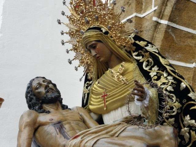 A las siete y cuarto de la tarde, puntualmente, se abrían las puertas de la capilla de la Caridad ante la expectación de cientos de ciudadanos que desde minutos antes se agolpaban a pie de calle para poder ver el discurrir de esta cofradía. A esa hora salía la Cruz de Guía abriendo el cortejo que acompaña a esta dolorosa que sostiene en su regazo a su hijo al pie de la cruz.