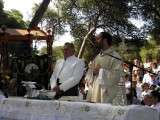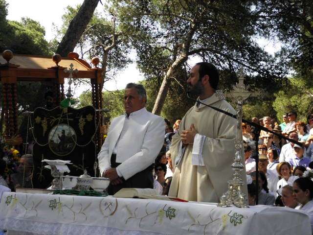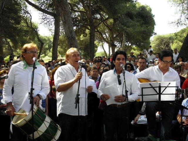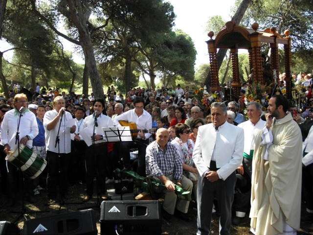Una vez en los pinares, donde el patrón de los agricultores llegó en torno a las once, y tras los minutos necesarios para organizar el cortejo en los pinares, con la ubicación de carretas y disposición del altar, casi llegadas las doce menos cuarto del mediodía, comenzaba la celebración de la Misa de Romeros. Oficiada por el padre Carlos Redondo, cura párroco de la parroquia de Nuestra Señora del Carmen, este año la eucaristía con la que se comienza la romería tenía un atractivo especial, y es que los componentes del exitoso grupo de sevillanas roteño Ecos del Rocío, fueron los encargados de cantar esta misa que fue seguida por centenares de roteños y turistas.