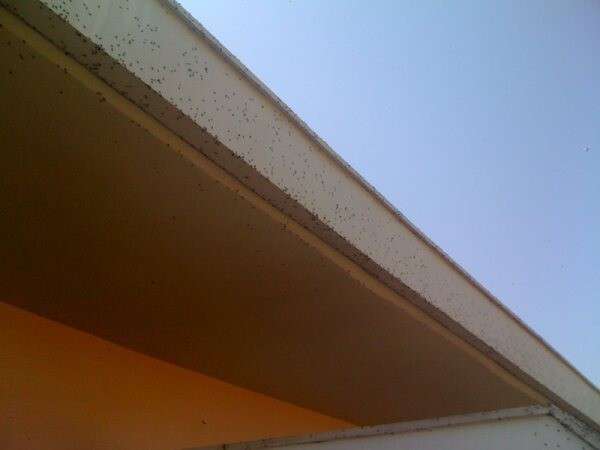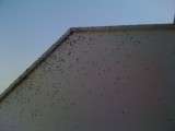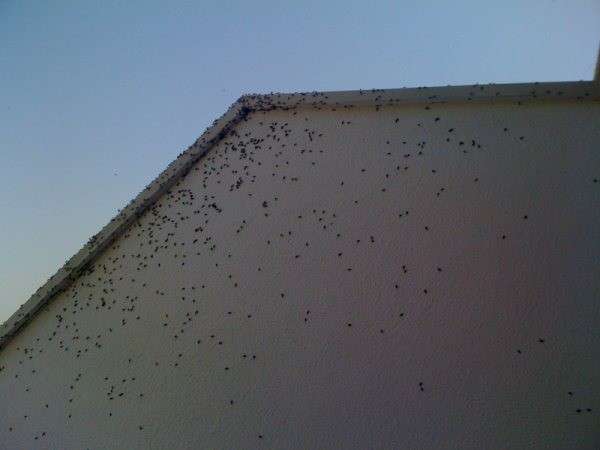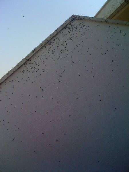 Ayer fue el primer día que apareció esta plaga que hoy ha vuelto a hacer acto de presencia en torno a las once y media de la mañana empezando a desesperar a algunos vecinos por las incomodidades que acarrean estos insectos, ya que las paredes se vuelven negras debido a la acumulación de mosquitos.