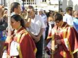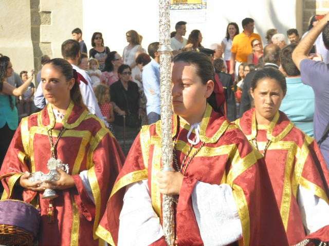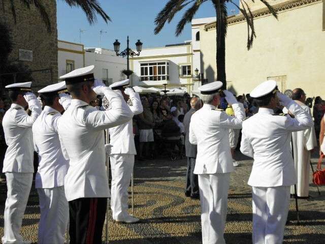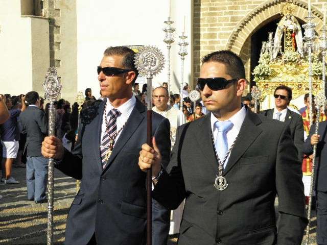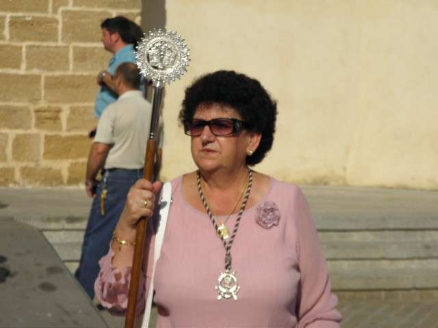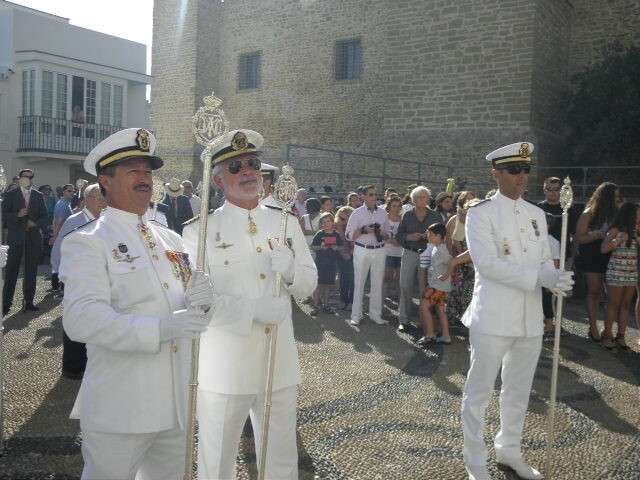 Desde la parroquia de Nuestra Señora de la O hasta el muelle pesquero "Astaroth", la imagen del Carmen estuvo acompañada por una comitiva formada por jóvenes y adultos de la Hermandad del Carmen que portaban las insignias, así como por miembros de la junta de gobierno de la hermandad presidida desde el año pasado por su hermana mayor, Rosa María Sánchez Caballero, el nuevo párroco de la O y director espiritual de la cofradía, representantes del Ayuntamiento, el presidente del Consejo Local de Hermandades y Cofradías, el cuerpo de acólitos y miembros de la Marina Española. Junto al paso de la Virgen, dos policías nacionales miembros de ASACRO lo custodiaban para dar un mayor realce al cortejo. Este año como novedad, además, miembros del Club Náutico Urta formaban parte de la comitiva portando la imagen de una virgen del Carmen que durante todo el año está sumergida en el fondo del mar roteño y que hace unos días rescataron para limpiarla y ayer devolvieron a su lugar de origen, "La Manzanera", situada a unos diez metros de profundidad en la playa de la Costilla. Hecho conmemorativo por el 40 aniversario de este club local.