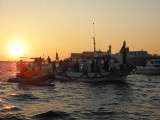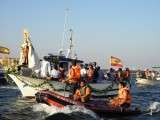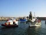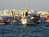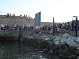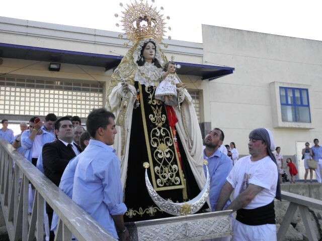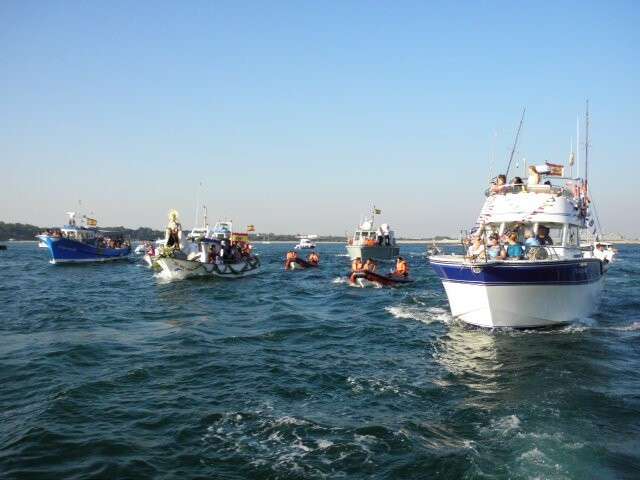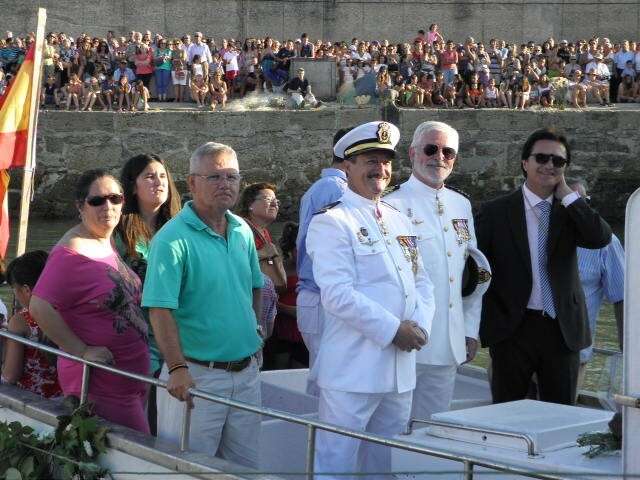 Ya en el muelle pesquero, en torno a las ocho de la tarde, la cuadrilla de costaleros guiados por el capataz José Bedoya Cerpa, procedían al traslado de la imagen del Carmen a la embarcación "Hermanos Corbeto", que tradicionalmente la porta para su salida por la costa roteña. Ayer, las temperaturas y el estado del mar permitieron no sólo que este paseo se desarrollara sin incidentes, sino que se prolongará hasta bien entrada la diez de la noche, por lo que la patrona de los marineros estuvo en el mar prácticamente dos horas. Más de una veintena de embarcaciones de distinto tamaño, entre ellas, una de Marina Española, formaba el cortejo marítimo de la Virgen del Carmen que recorrió pacientemente buena parte de la línea litoral, desde el muelle hasta el Hotel Playa de la Luz y a su vuelta, hasta la playa del Chorrillo, disfrutando de una salida que normalmente las condiciones del mar impiden. Durante esta travesía, escoltada por embarcaciones de Protección Civil, buzos del Club Náutico Urta aprovecharon para depositar en su lugar de origen la imagen de piedra de la Virgen del Carmen que desde hace años está sumergida en el fondo del mar y que hace unos días la sacaron para limpiarla y exponerla en la parroquia del Carmen. La talla, de unos 9 kilos de peso, iba en la embarcación "Delgado" desde donde se entregó a los buzos que la devolvieron al fondo marino de donde quizás vuelva a recuperarse el año que viene por estas fechas. La inmersión fue rápida y estuvo acompañada de una ofrenda floral a la que siguieron unos metros más de paseo hasta que casi coincidiendo con la caída del sol, las embarcaciones tornaron rumbo al muelle pesquero.