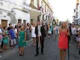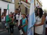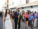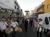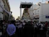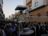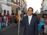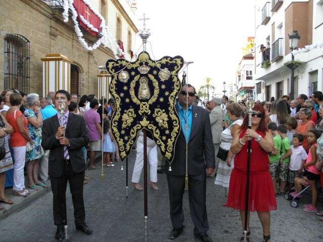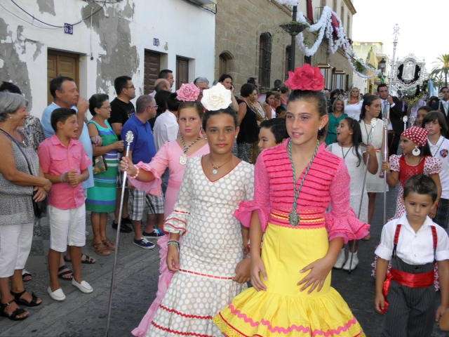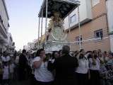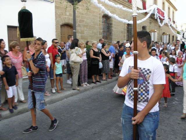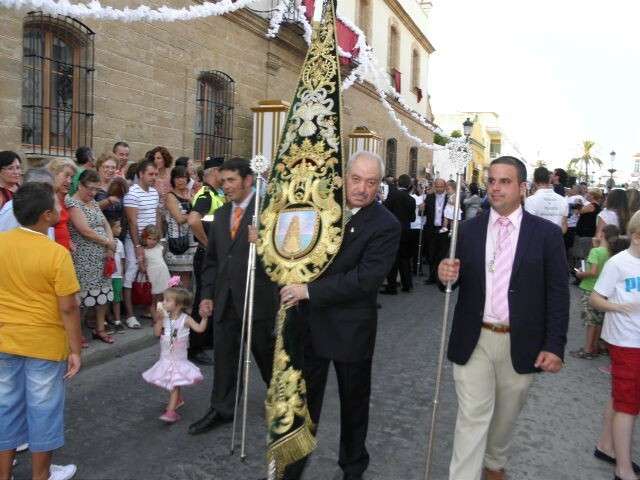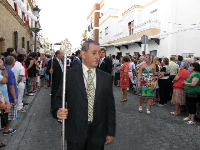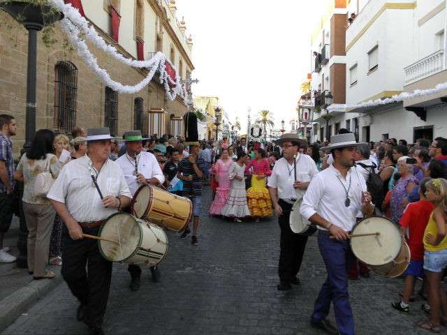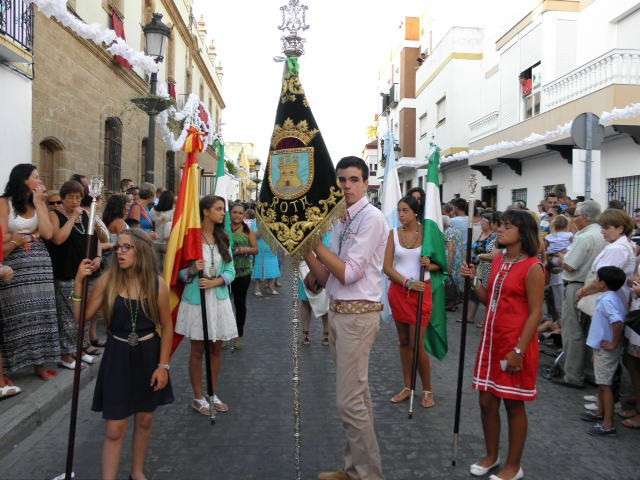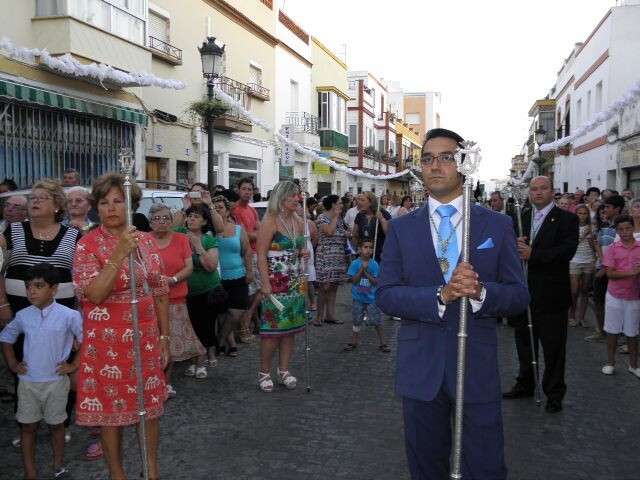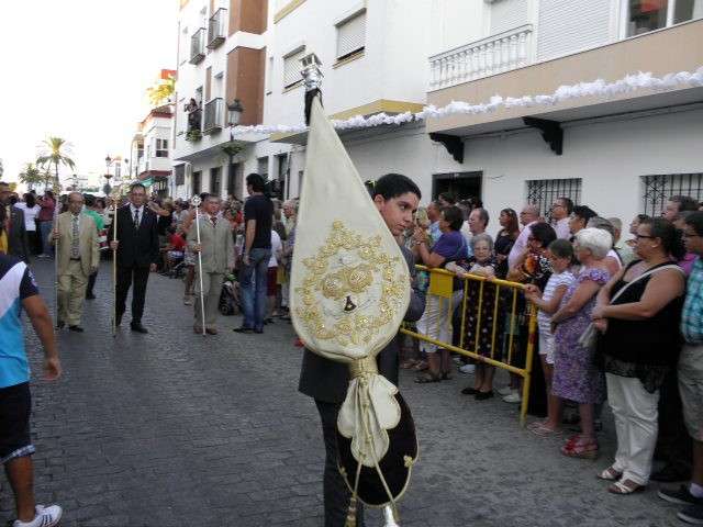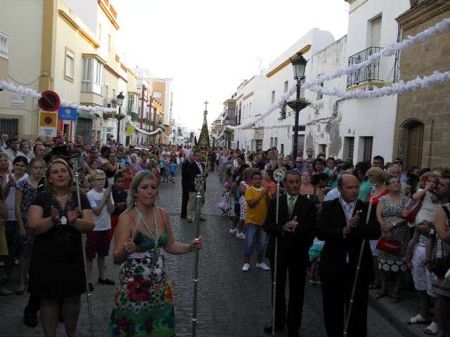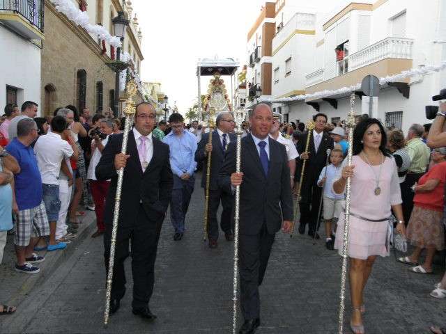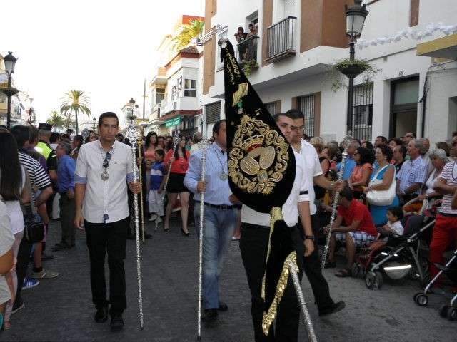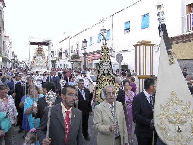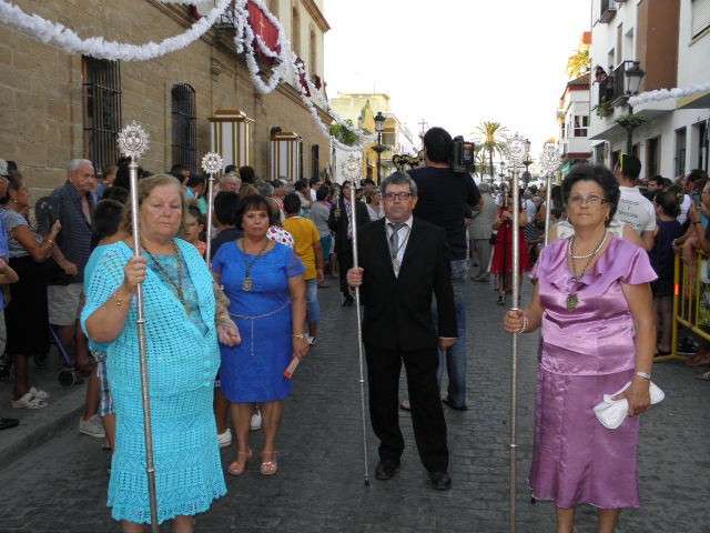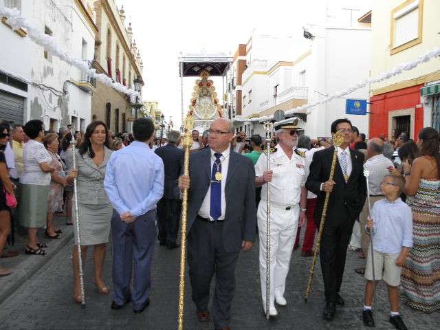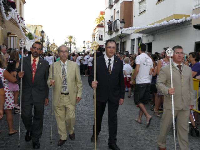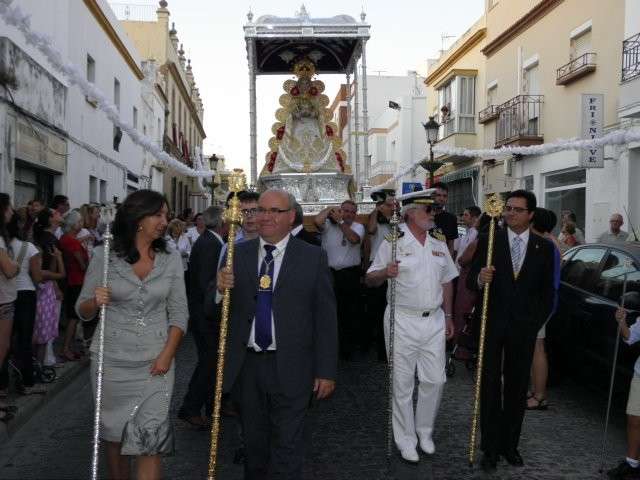 Tras la misa de las siete y media de la tarde, desde la parroquia de Nuestra Señora del Carmen comenzaba a desfilar el cortejo que durante todo el recorrido acompañaría a la Madre de Dios. Minutos antes de las nueve de la noche, y en una calle Calvario engalanada para la ocasión, abrían el cortejo los piteros de Rota y de otras localidades vecinas que fueron a lo largo de todo el recorrido los encargados de poner el toque musical junto a otros grupos rocieros y cantantes en solitario que le dedicaron a la virgen canciones en distintos puntos. Con los piteros a la cabeza, seguía una buena representación del Grupo Joven de la hermandad que portaban diferentes insignias y banderas que se sumaban a los representantes de la junta de gobierno del Rocío, de la Hermandad del Santo Entierro, del Amor, de San Isidro y de las hermandades chipioneras de Regla del Pinar y del Rocío de Chipiona. Antes del paso iba la presidencia donde estaban el hermano mayor de la Hermandad del Rocío de Rota, la alcaldesa de la localidad, el almirante de la Base Naval y el presidente del Consejo Local de Hermandades y Cofradías de la villa.