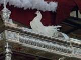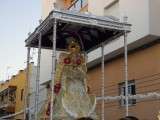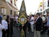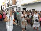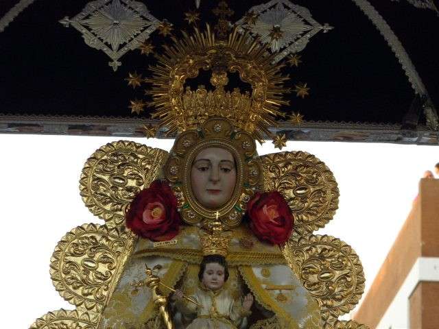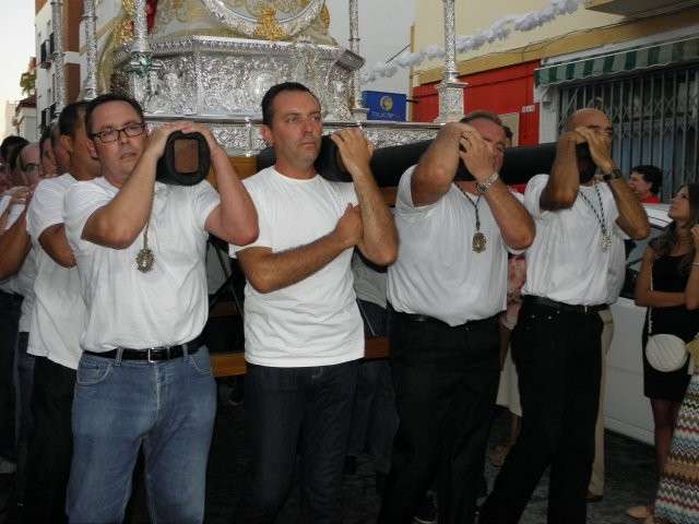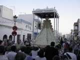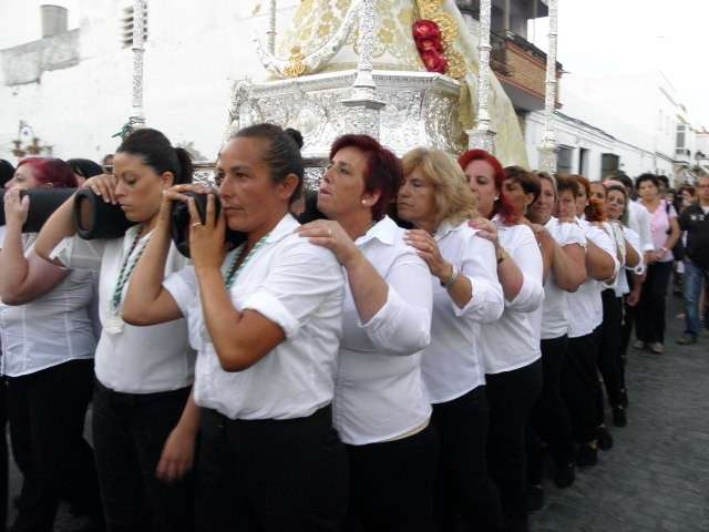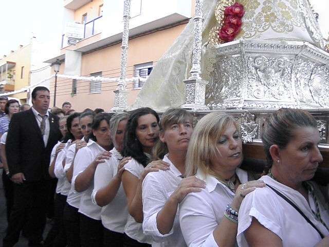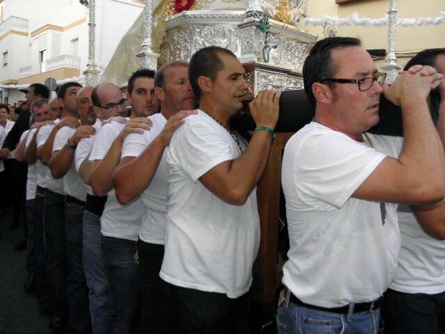 El momento clave llegaba cuando la cuadrilla de cargadores que este año se sumaba a la de mujeres que portaron a la virgen el año pasado, hacía su aparición por la puerta de la parroquia, rodeada de muchos fieles y devotos que no quisieron perderse esta salida de la Blanca Paloma. El paso plateado realizado en los Talleres de Orfebrería Sanluqueña acogía una imagen del Rocío que lucía vestida de reina con traje y capa de estreno, gracias a la comisión de mujeres de la hermandad. También el niño estrenaba su túnica, así como la media luna situada a los pies de la virgen. Ayer, todo eran estrenos para un día que se vivió con especial intensidad para aquellos que profesan su fe a la virgen en su advocación de Rocío. Momentos de gran ilusión y de satisfacción por ver el resultado del trabajo realizado durante todo un año que los hermanos de esta hermandad compartieron con el pueblo de Rota. A su salida, dos palomas blancas se soltaron antes de iniciar el recorrido y miembros del grupo rociero de la hermandad dedicaron canciones a virgen. La Blanca Paloma bajaba la calle Calvario, este año adornada con flores de papel blanco y dos columnas a las puertas de la iglesia, hasta la Casa Hermandad del Rocío que pese a estar cerrada, fue la primera parada que se hizo para rezar una salve en torno a Ella. También en este punto comenzó la alternancia entre la cuadrilla de mujeres y hombres que durante las cuatro horas que estuvo en la calle, portaron el paso ayudándose así en esta tarea.