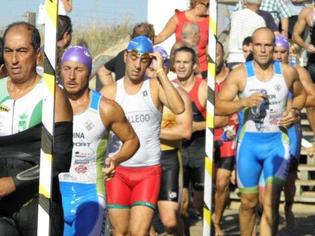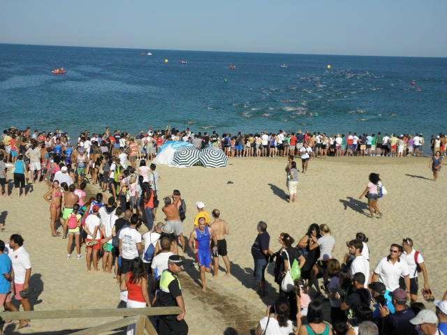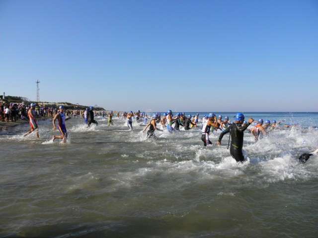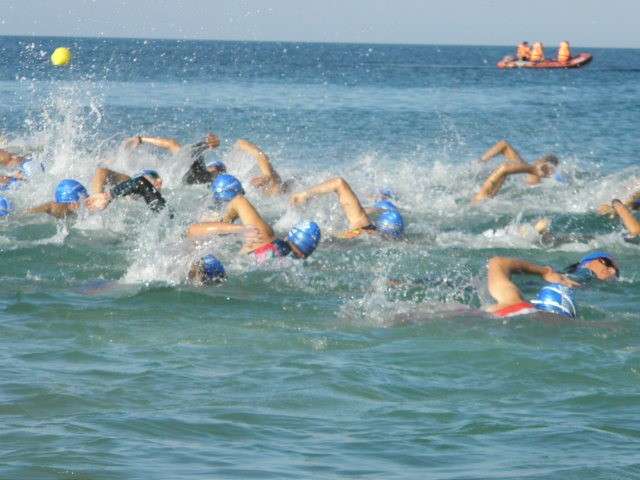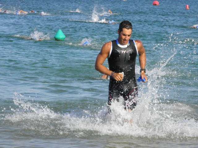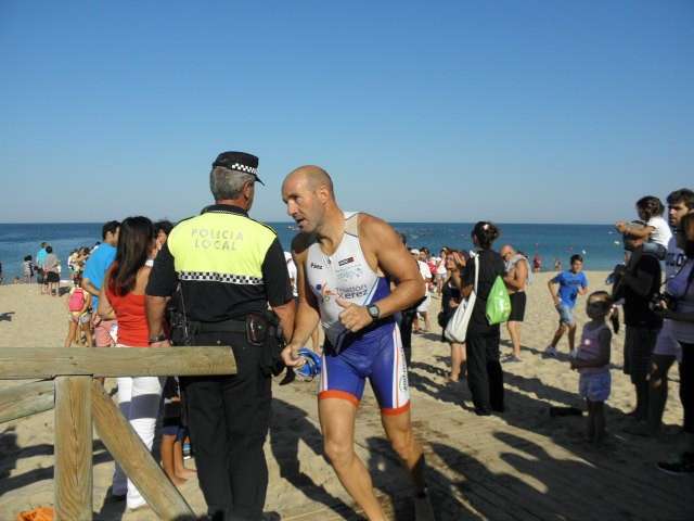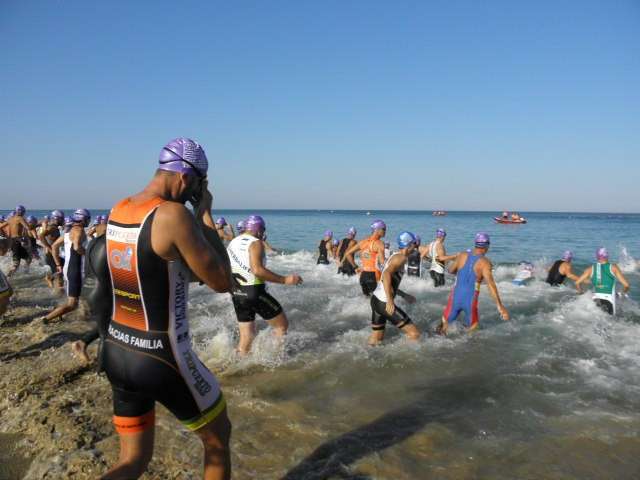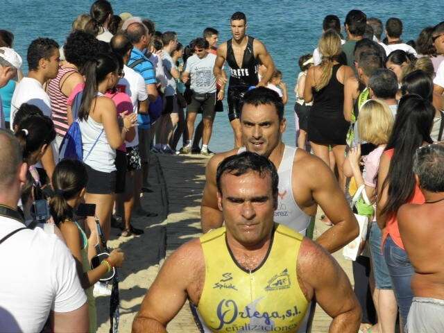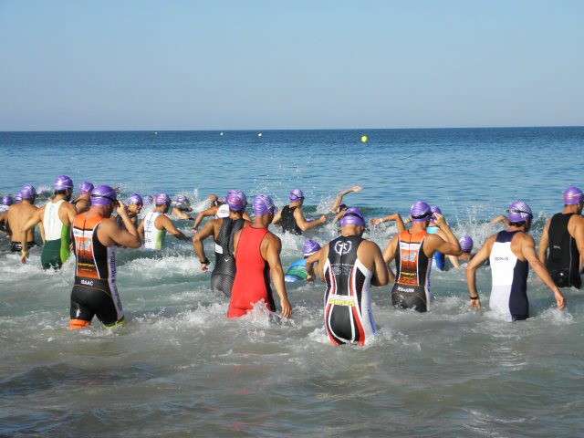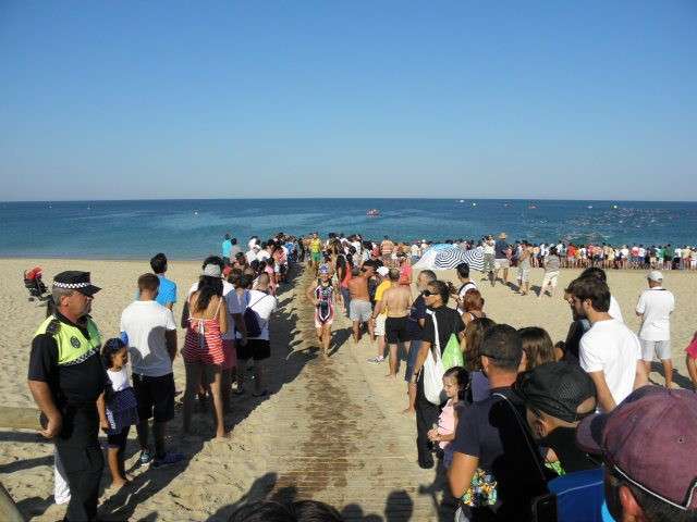 A las diez de la mañana y con unas temperaturas bastante veraniegas, el domingo ha comenzado para unos 420 corredores a pie de orilla desde donde han partido para enfrentarse al circuito de esta triatlón.  Este año, y esa era una de las novedades, los triatletas han salido en dos grupos, primero los federados y féminas y unos minutos después, los no federados, de este modo se ha intentado que los inicios del recorrido sobre todo en natación y bici fueran más escalonados para preservar la seguridad de los participantes. Lo primero que han tenido que afrontar han sido los 750 metros de natación en la playa de Punta Candor donde desde primera hora ya había bastante público para animar a los corredores. La verdad es que esta es una prueba que reúne no sólo a muchos deportistas sino a numerosos aficionados que no han parado de dar ánimos y gritos de aliento a sus familiares, amigos y conocidos, lo que ha contribuido a un estupendo ambiente.