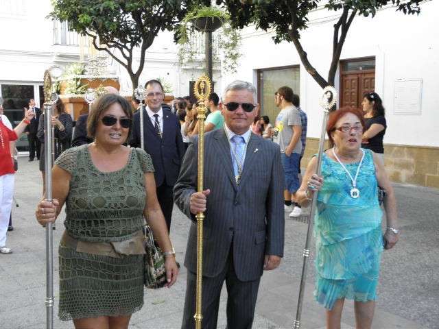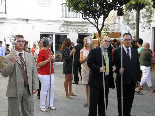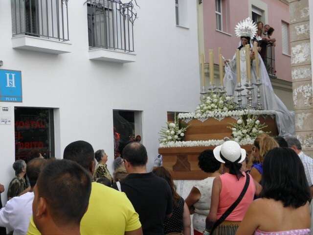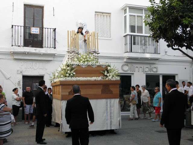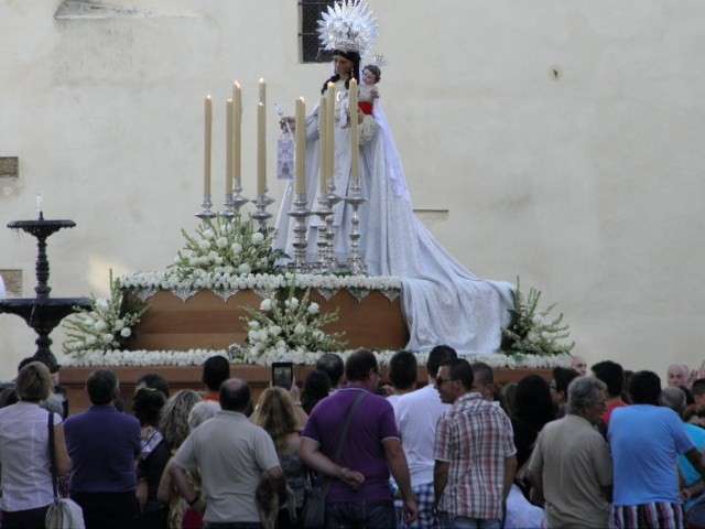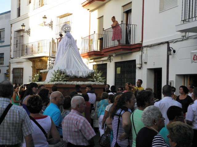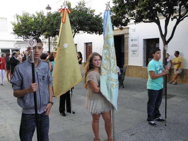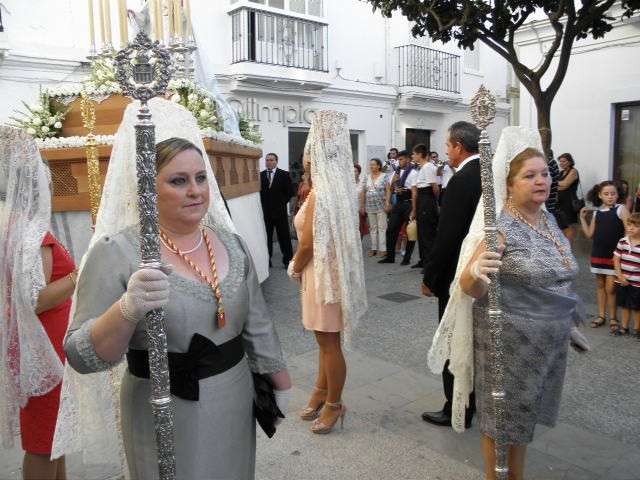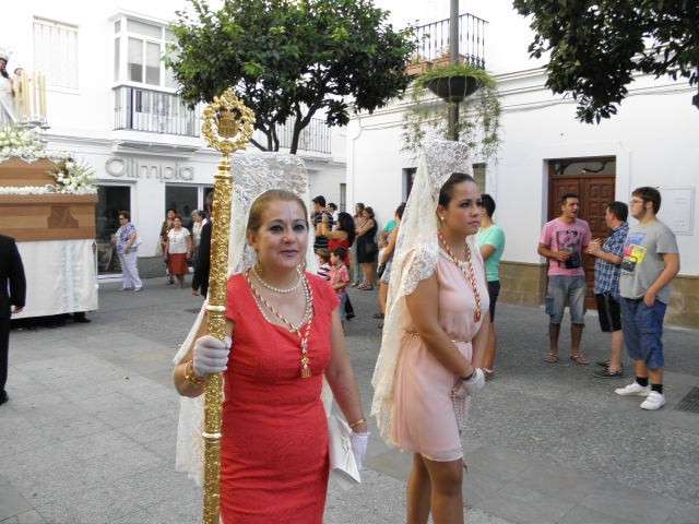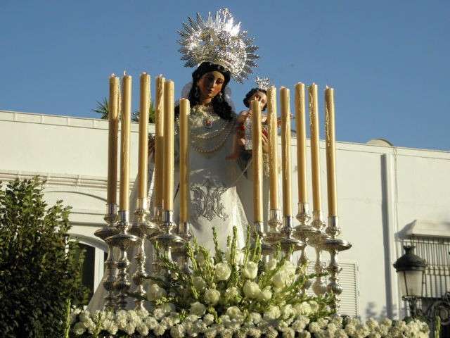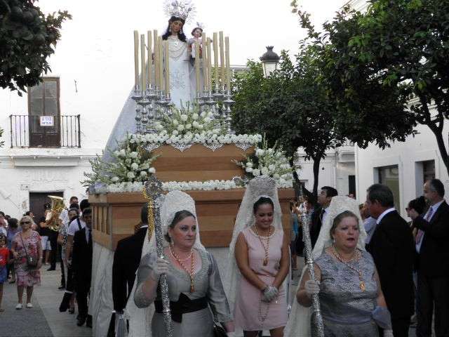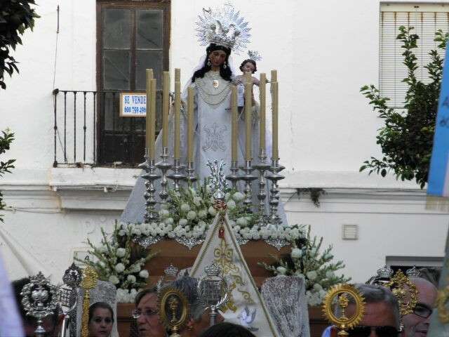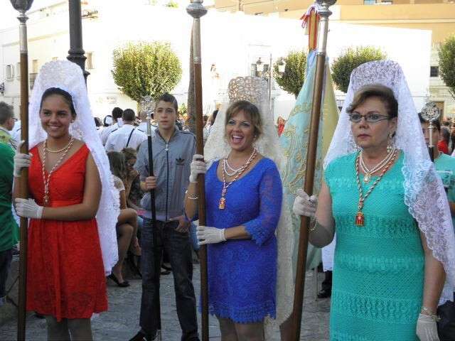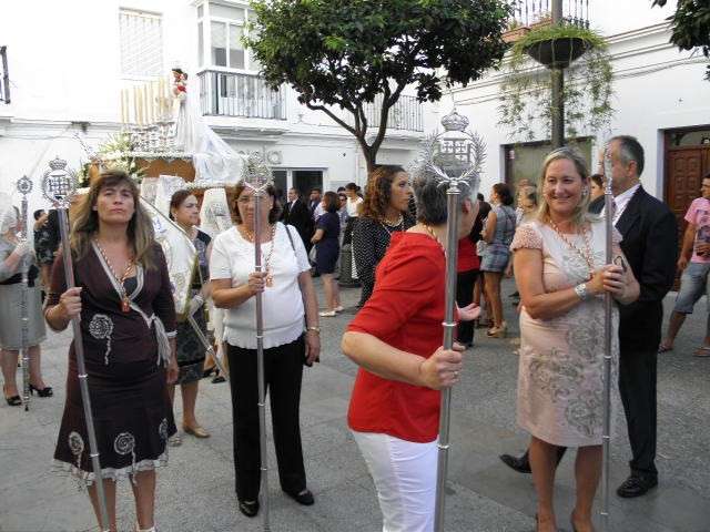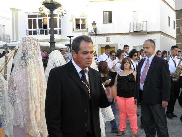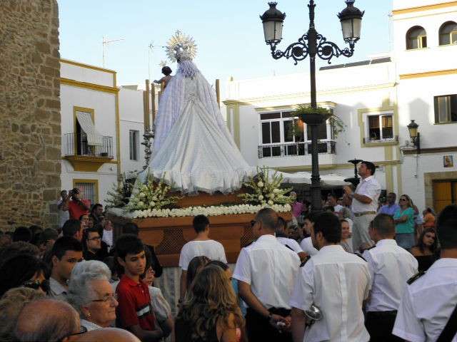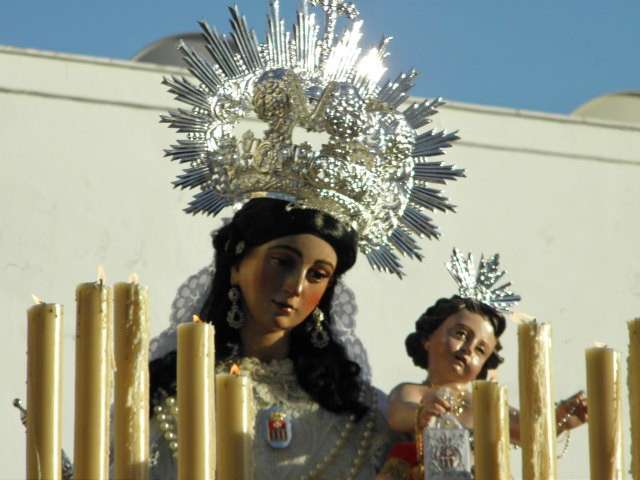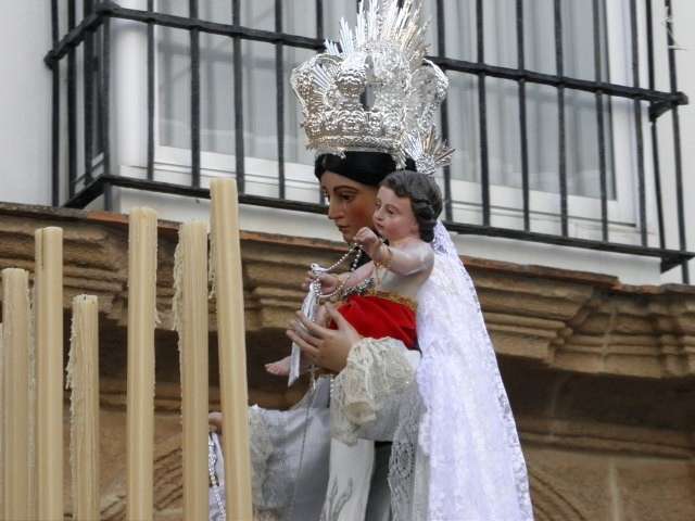 Con un cortejo reducido, donde destacó la presencia de mujeres que lucían la tradicional mantilla española y representantes de algunas hermandades roteñas, la Virgen partió pasadas las siete de la tarde de la parroquia de Nuestra Señora de la O donde comparte capilla con Nuestro Padre Jesús Nazareno desde que hace ocho años fuera restaurada la talla que ayer procesionaba por la villa.