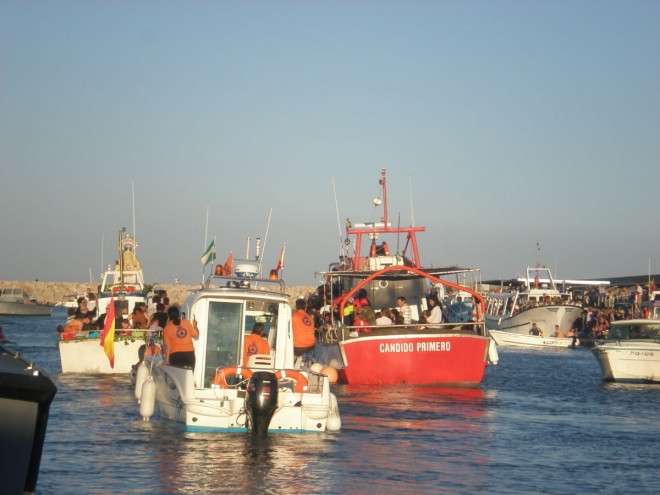 Acompañada por un pequeño cortejo formado por miembros de la junta directiva de la Hermandad de Nuestra Señora del Carmen, miembros del Consejo Local de Hermandades y Cofradías y por algunos miembros de Armada Española, la Virgen fue portada por sus 20 jóvenes costaleros hasta el muelle pesquero de la Villa. Allí, fue trasladada en su peana hasta el barco marinero "Hermanos Corbeto" para iniciar su procesión marítima. Un recorrido por la costa roteña que no haría sola, la acompañaban en torno a una treintena de barcos, entre marineros y deportivos, que la siguieron por la playa de la Costilla mientras cientos de roteños la despedían desde las inmediaciones del muelle Astaroth.