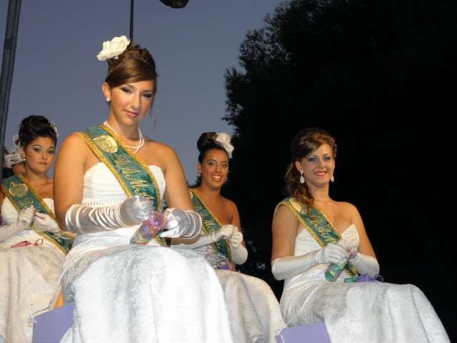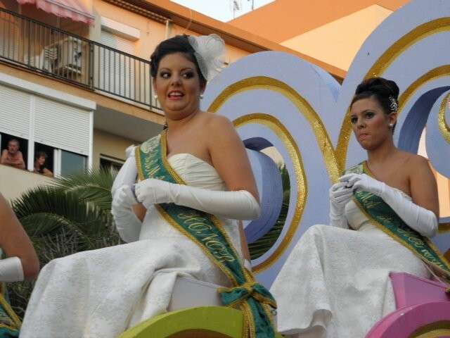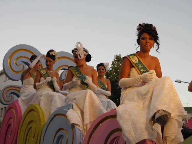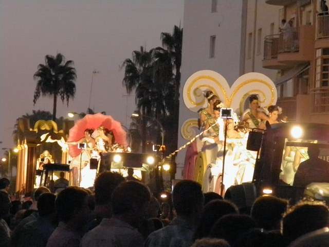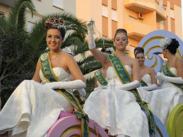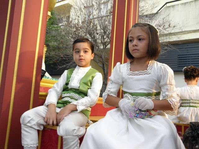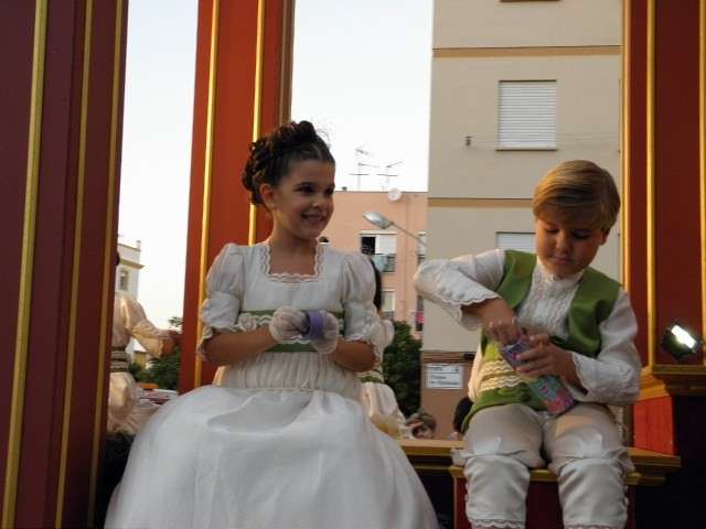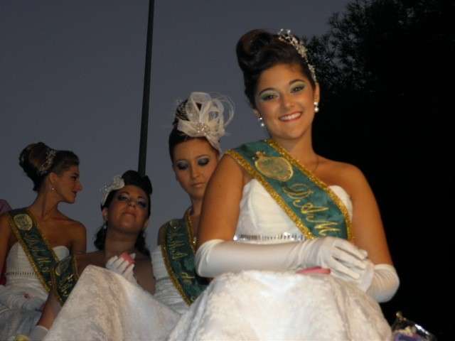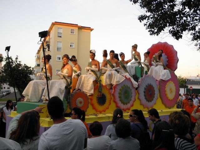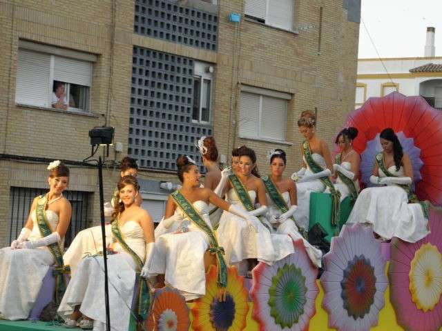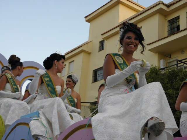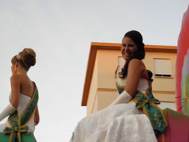 Sobre las siete y media de la tarde partía el cortejo desde la explanada de Renfe para enfilar las calles y plazas del recorrido previsto. Mucho público ha vuelto a salir a la calle para disfrutar de este desfile que de nuevo, y como consecuencia de la crisis y los recortes, se ha visto muy reducido con tan sólo tres carrozas para las 22 damas del Rosario, lo que ha provocado que de nuevo, las jóvenes vayan algo apiñadas. Aún así, una vez más, todas han lucido su mejor cara, han vuelto a mostrar el traje blanco que ya estrenaran el día de la coronación de la Dama Mayor el pasado viernes y han lanzado serpentinas a los ciudadanos que esperaban en las aceras. Público que se ha ido multiplicando a medida que la cabalgata ha ido llegando a la zona más céntrica, principalmente, la avenida María Auxiliadora y San Fernando donde las aceras estaban llenas.