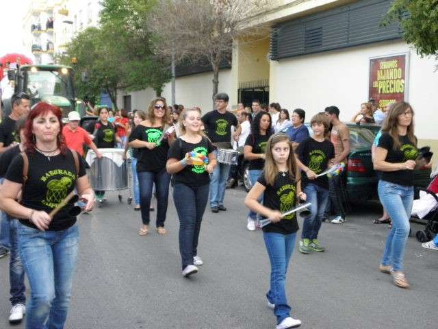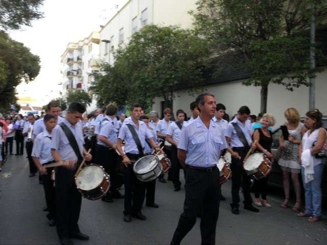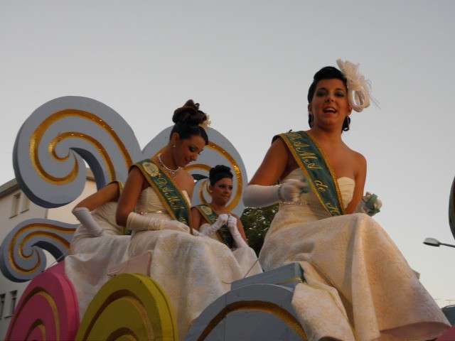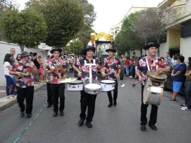 Tras las cinco naves espaciales, aparecía la primera de las carrozas con diez damas del Rosario sucedida por la batukada "Caipirinha" que ha animado bastante el cortejo como suele ser habitual. Le seguía la segunda de las carrozas con el resto de las damas y una charanga que abría paso a la nueva carroza que este año se estrenaba portando a la Dama Mayor, Alba Helices, junto a sus ocho pajes. Como cierre del cortejo, la banda municipal de música "Maestro Enrique Galán".