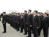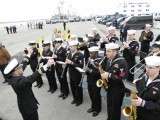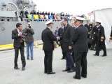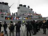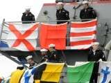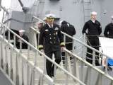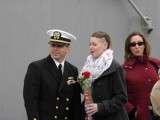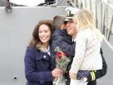 Muy despacio ha entrado el buque en puerto, adornado para la ocasión con múltiples banderas y con la tripulación en cubierta ante la atenta mirada de compañeros de la Marina Americana y Española que lo esperan desde que el pasado 31 de enero partiera con rumbo a la Base Naval de Rota desde Norfolk (Virginia). En esta ocasión, y puesto que las familias de estos tripulantes se prevé que lleguen en el mes de junio, no se ha producido la típica estampa masiva de reencuentro entre familias, tan sólo una decena de ellas han protagonizado este momento que ha sido captado por los numerosos medios de comunicación que estaban acreditados para este evento.