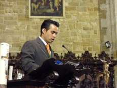 Presentado por su amigo Marco Antonio Sánchez Peña, que estuvo algo nervioso, el pregonero fue presentado como el tercero de cuatro hermanos, hijo de un roteño y una chipionera. Joven dedicado al campo y de profundas convicciones religiosas, es ejemplo de humildad, fe, amor y esperanza, amigo de sus amigos y persona especial. Así lo veía su presentador y así lo presentó ante el público presente en la parroquia de la O en cuyo altar se encontraba la imagen de San Isidro arropada por exorno floral. Marco Antonio Sánchez Peña, que ya fue pregonero del patrón de los agricultores hace unos años, aprovechó su presencia en el atril para dedicar palabras de agradecimiento al santo. Acto seguido, dio la palabra a su compañero y amigo que recibía la medalla de la hermandad de manos del hermano mayor, Antonio Beltrán.