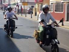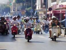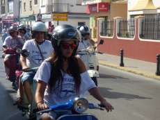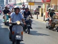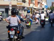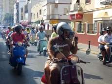 Muchos roteños y turistas se han topado esta mañana con más de un centenar de vespas, de todos los modelos y colores, por el centro de la localidad de donde pasadas las once y media, ha partido la II Vesparoth de Rota. Una cita convocada especialmente para los aficionados a este clásico de las motos que ha llamado la atención de muchos ciudadanos y ha dado ambiente desde primera hora.
