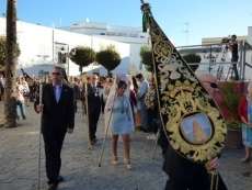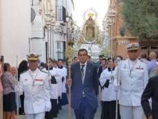 Nuestra Señora del Rosario salía de la parroquia de Nuestra Señora de la O puntual tras haberse acercado a la capilla del Nazareno para tener un detalle con la titular, Nuestra Señora de la Amargura, que cumple 50 años desde la bendición de su talla. Tras este gesto, la virgen salía de la parroquia precedida de un cortejo en el que estuvieron representadas las asociaciones parroquiales, las archicofradías de María Auxiliadora, todas las hermandades de penitencia y gloria, que procesionaron en orden de antigüedad, además de mujeres de mantilla entre las que estaban las 25 damas del Rosario. Autoridades civiles y militares, con representantes de la Base Naval, de la Policía y Guardia Civil, así como miembros del Consejo Local de Hermandades y Cofradías, precedían a la patrona que iba escoltada por dos agentes de la Benemérita, tradición que se recuperó hace unos años.