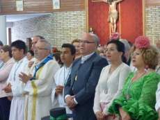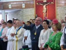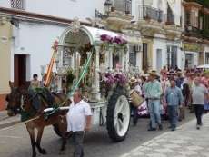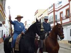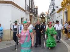 La carreta ha iniciado el cortejo pasadas las nueve y media de la mañana con varios caballos abriendo la comitiva seguidos de rocieros luciendo el típico traje para esta ocasión. A lo largo del itinerario previsto, el mismo que se estrenó el año pasado y que hizo que por primera vez tras varios siglos, el Simpecado llegara hasta la parroquia de Nuestra Señora de la O, la presidencia, compuesta por el director espiritual de la hermandad, Carlos Redondo, el hermano mayor, Juan Manuel Montes, dos concejales del Ayuntamiento de Rota y un representante de la Base Naval, ha ido haciendo paradas para realizar varias ofrendas. La primera de ellas ha tenido lugar en la capilla de la Caridad, seguida de visita a la Parroquia Mayor donde han depositado varios ramos de flores en las capillas del Sagrario, de la patrona Nuestra Señora del Rosario, en la del Nazareno y en la del Santo Entierro. En todas, los respectivos hermanos mayores de las hermandades representadas, han deseado a los rocieros un buen camino y protección para todos los roteños.