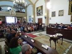 El salón capitular del Palacio Municipal Castillo de Luna ha estado lleno de ciudadanos que han arropado a esta nueva Corporación en quien han confiado para el mejor desarrollo de la localidad; un grupo de roteños que hoy han jurado o prometido su cargo ante la Constitución para hacer valer los derechos de la Carta Magna durante su mandato. Cada uno de los 21 concejales, en orden de menor a mayor número de votos obtenidos en las urnas, ha cumplido con el protocolo de este tipo de actos donde los dos componentes de la mesa de edad compuesta por el concejal más adulto y el más joven, en este caso, Francisco Laynez y Laura Luna, respectivamente, han ido imponiendo las medallas que los acredita como miembros de la Corporación local.
