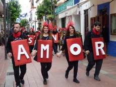 [Img #53785]Los alumnos del Grado Medio de Actividades Comerciales y del Grado Superior de Espacio Comerciales del IES Arroyo Hondo, han vuelto a protagonizar esta mañana un nuevo "street marketing" con el que han intentado animar la zona centro con motivo de la inminente celebración del día de San Valentín. Para ello, vestidos de negro con adornos rojos, ha portado letras con las que a lo largo de sus paseo, han ido formando palabras de amor relacionadas con el 14 de febrero.  Ha sido una nueva propuesta de marketing en la calle que ahora está tan de moda para llamar la atención del público.