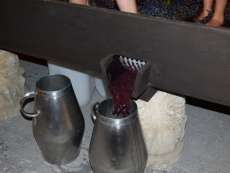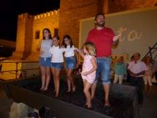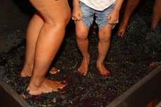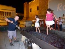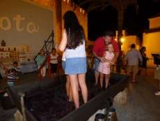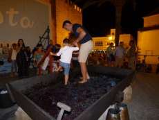 Unos 200 kilos de uva tintilla se han volcado en el lagar ubicado en el escenario de la plaza Bartolomé Pérez que este año se encontraba bastante animada con la actuación de grupo flamenco de Rosa "La Piñonera". Su potente voz ha reunido a bastante público en torno al escenario desde el que cantaba mientras los más atrevidos se descalzaban, remangaban el pantalón o se subían algo el vestido para evitar manchas, y se disponían a sentir la sensación de pisar la pequeña uva tintilla de la que se extrae el vino más local que en el pasado tuvo un lugar destacado en el mundo del vino.