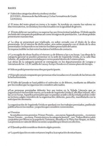 Los relatos cortos que se pueden presentar a este certamen, que se convoca con el único tema central de la mujer en cualquiera de sus aspectos, no debe superar las 300 palabras. Como ya ocurriera el año pasado, en esta edición se abre la participación a dos categorías, la general y la de Bachillerato, esta última para dar cabida a aquellos jóvenes aficionados a la escritura que cursan Bachillerato o algún Grado Medio y quieran participar. Para ello, se cuenta con la colaboración de los IES Castillo de Luna y Arroyo Hondo, que a través de sus Departamentos de Lengua y Literatura harán llegar los textos participantes a la asamblea local de IU que convoca. Para el resto de interesados, pueden dejar sus relatos cortos bien en la misma sede de IU, situada en la calle Blas Infante, 18, o por correo postal, a la dirección indicada (c/ Blas Infante, 18. CP 11520 - Rota). El plazo máximo de presentación será el 22 de febrero.