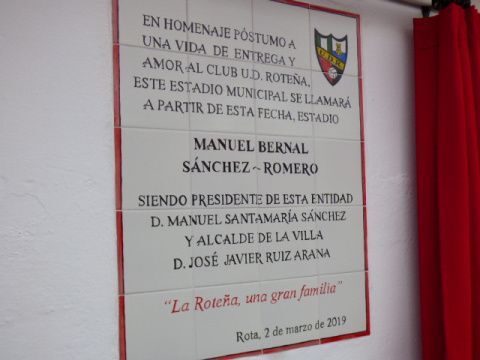 Tras el acto de intervenciones, fueron el alcalde de Rota, Javier Ruiz, y el presidente de la UD Roteña, Manuel Santamaría, los que acompañados de la familia, descubrieron la nueva rotulación exterior del estadio y posteriormente, el azulejo que en el interior de las instalaciones, también luce en recuerdo del que está considerado como eterno presidente de la entidad.
