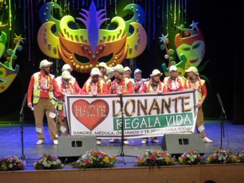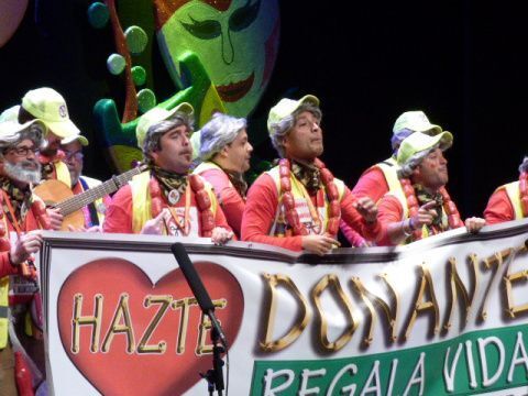 Como fin a esta primera parte del acto del Pregón de Carnaval, subía al escenario la chirigota "Este año vengo que muerdo" que interpretaron varias letras, entre ellas, una muy sentida sobre la campaña de donación de órganos, sangre, médula o tejido que el roteño José Ignacio Ruiz-Herrera ha impulsado en la localidad. A él lo hicieron subir para que acompañara en la actuación que fue muy aplaudida por todo el público que llenó el auditorio y donde una vez más, se desplegó la pancarta con el eslogan "Hazte donante, regala vida".
