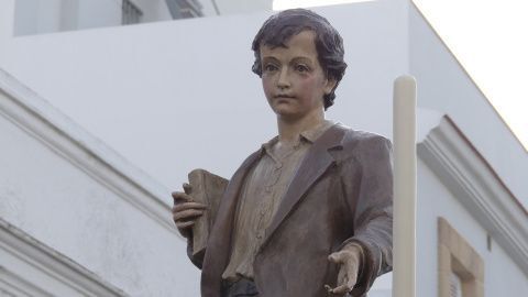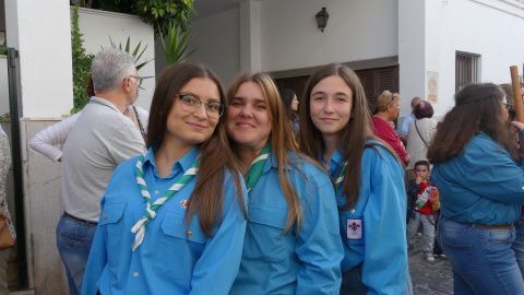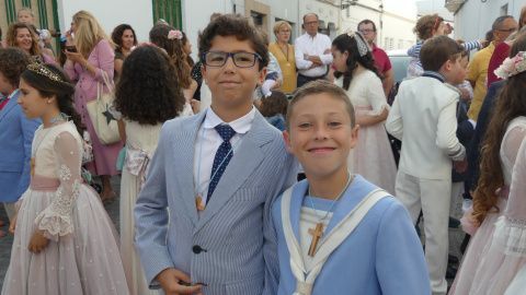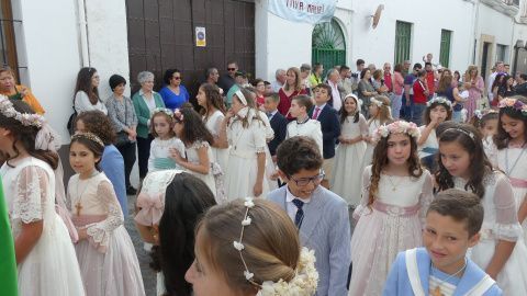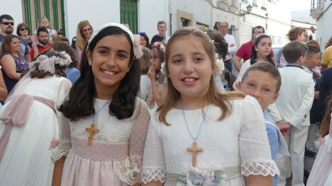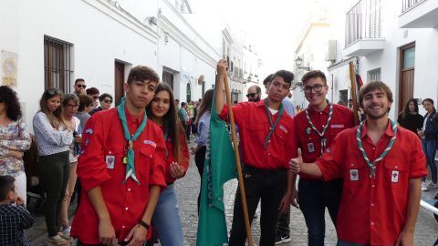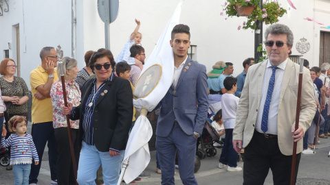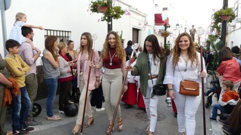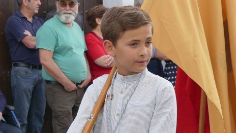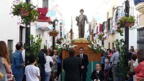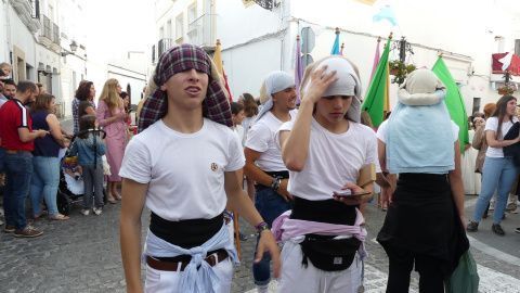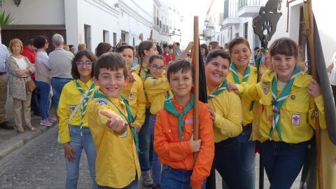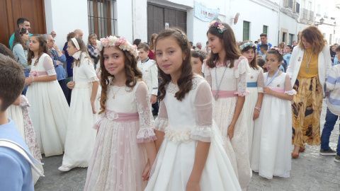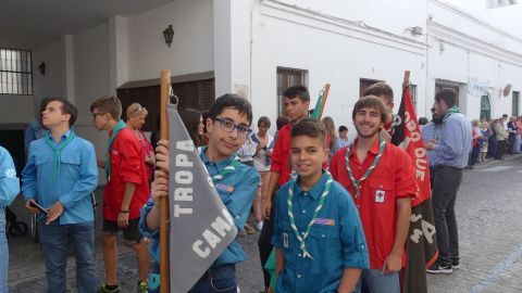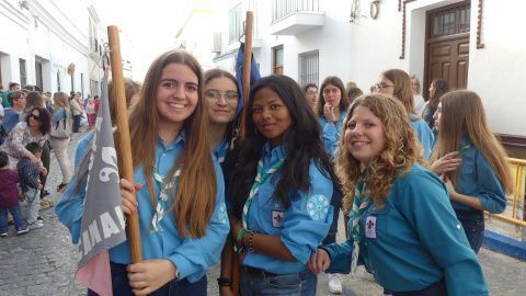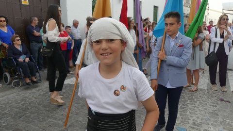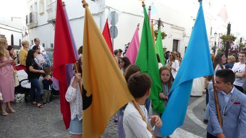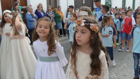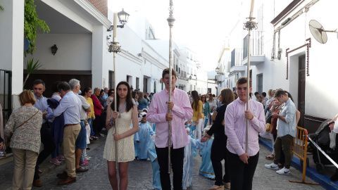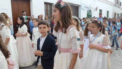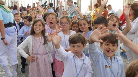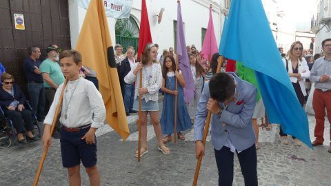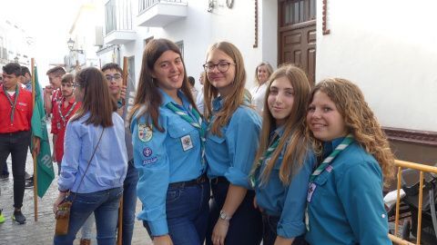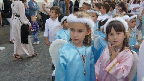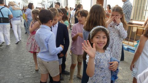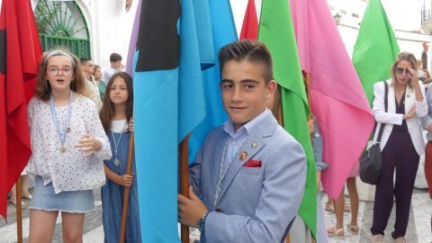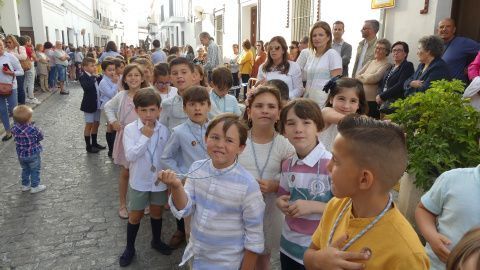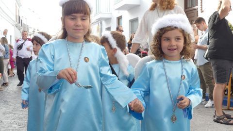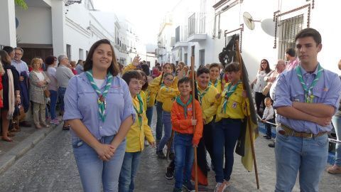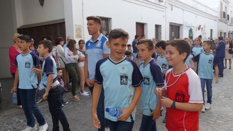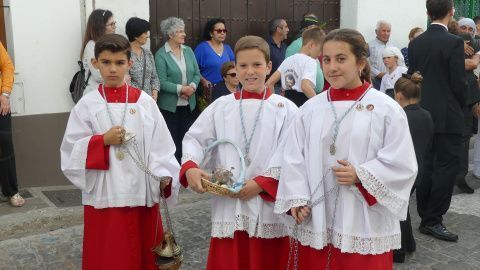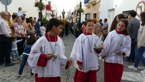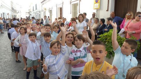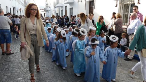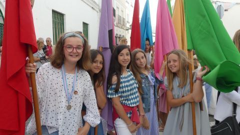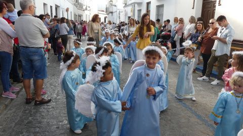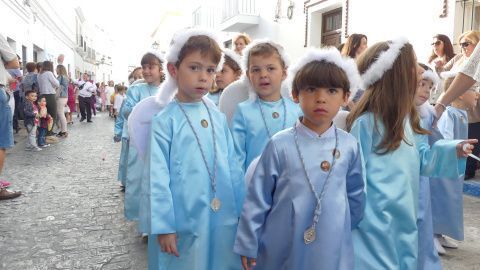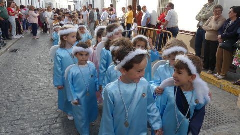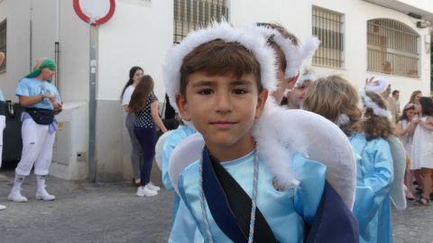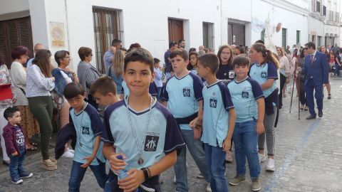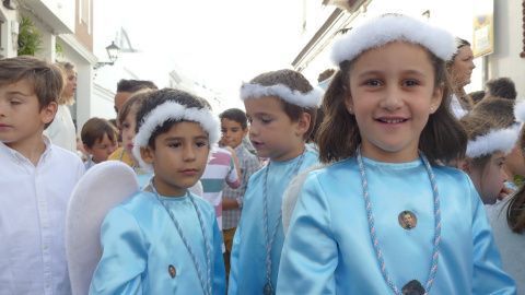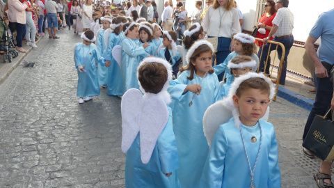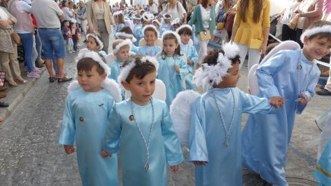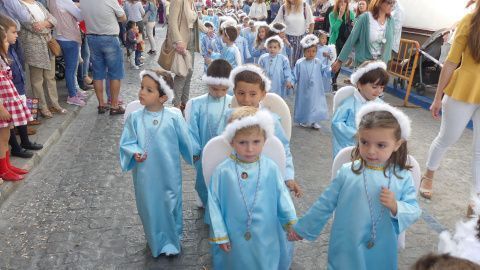 Abriendo el cortejo, como siempre, los pequeños angelitos, alumnos de Infantil del colegio Nuestra Señora del Rosario que suelen dejar las estampas más entrañables de una larga comitiva donde también se pudo ver a niños vestidos de calle, alumnos que este año han tomado su Primera Comunión, representantes del grupo scouts "Santo Domingo Savio" y de las asociaciones parroquiales de María Auxiliadora, padres y madres del AMPA y hasta pequeñas vestidas de mantilla. No faltaron a esta cita los seises, alumnos portando banderas e insignias y representantes de la escuela de fútbol.