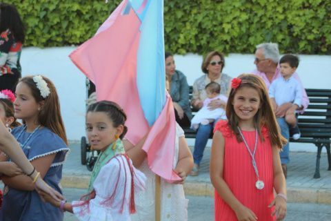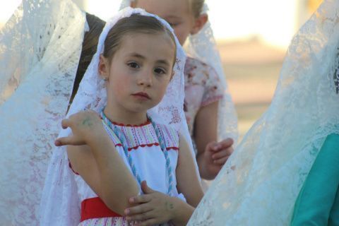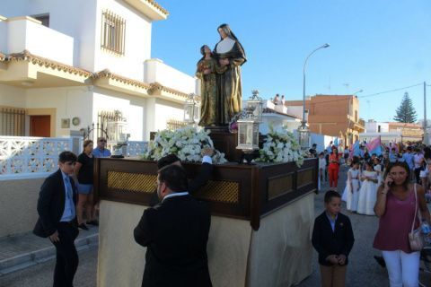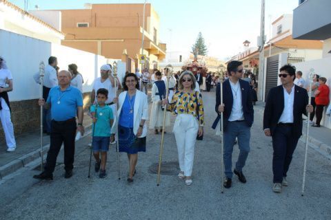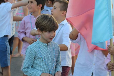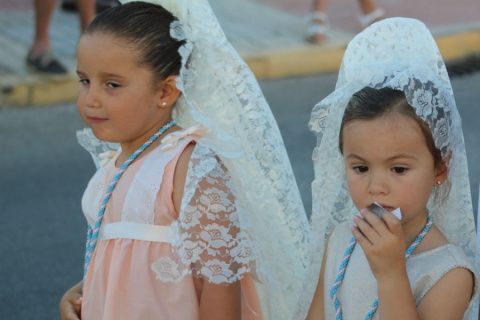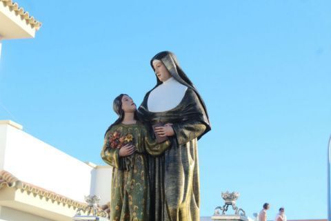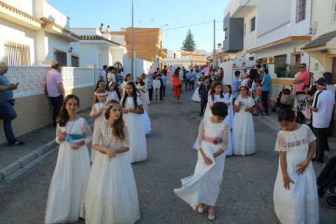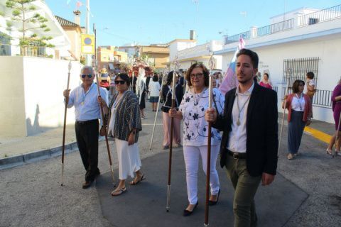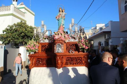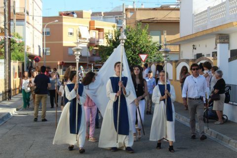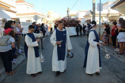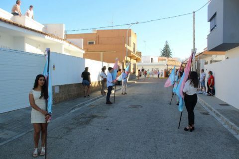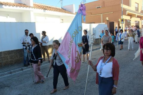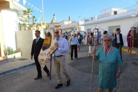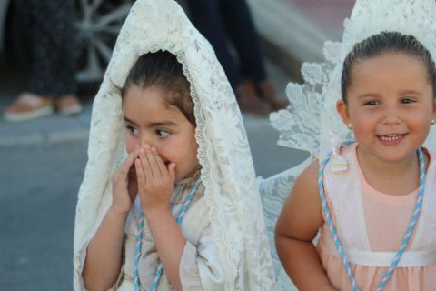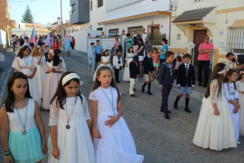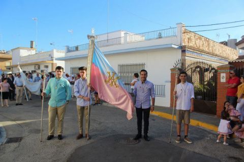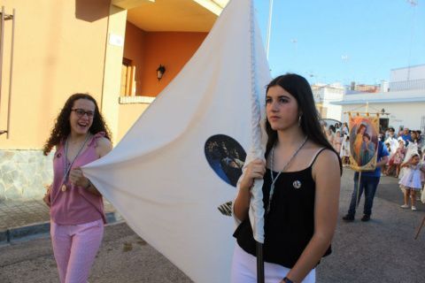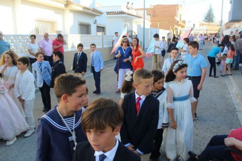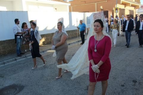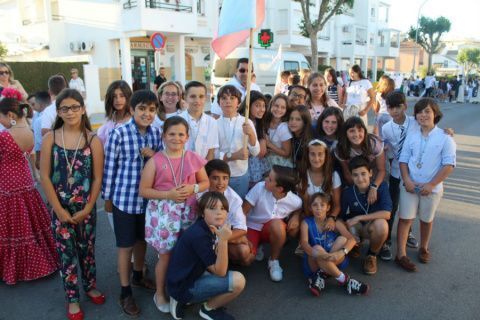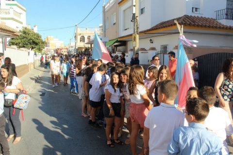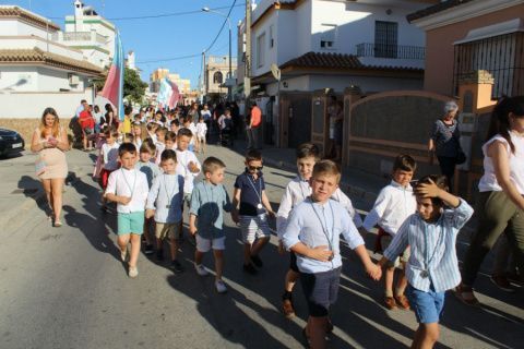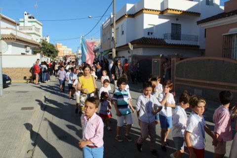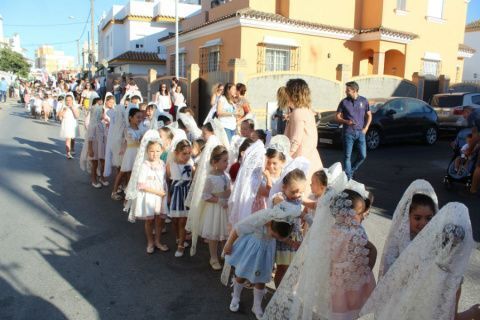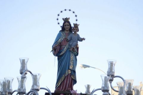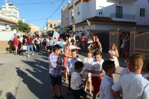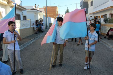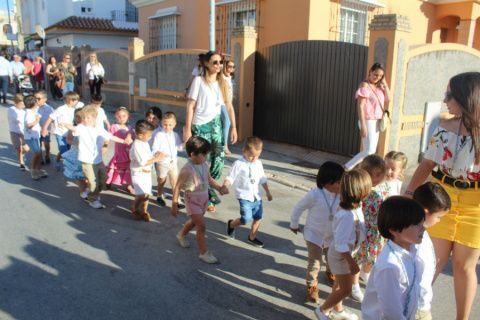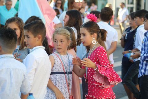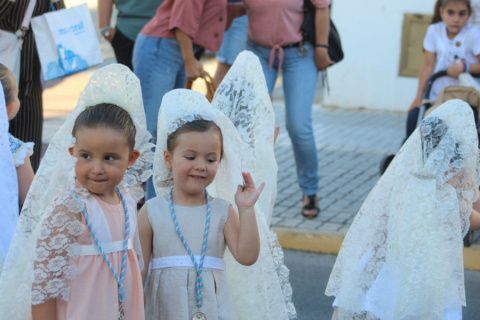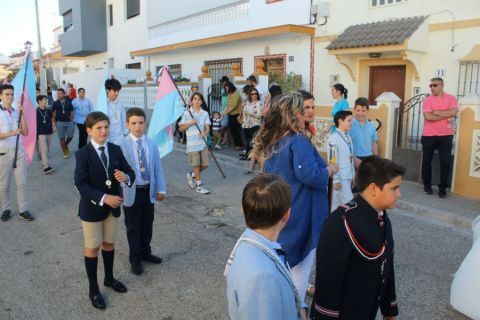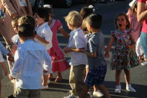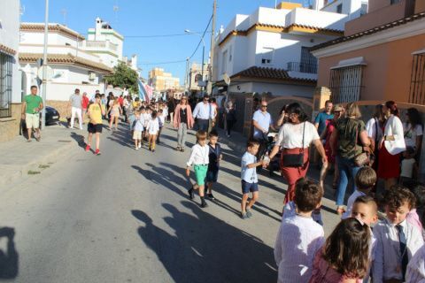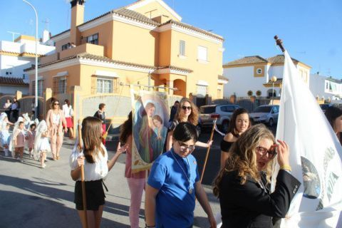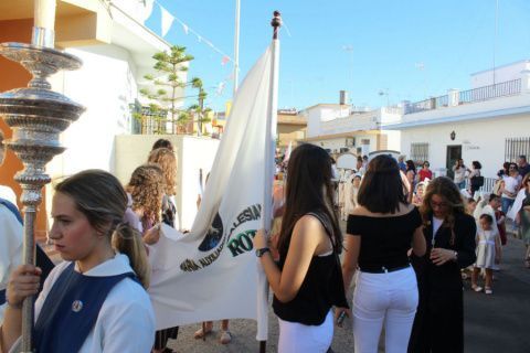 Pequeñas de mantilla, niños vestidos de calle portando banderas, algunas de flamenca, de Primera Comunión y representantes del centro, entre profesores y personas vinculadas al día a día, abrían paso primero a María Mazzarello, para seguirle después María Auxiliadora sobre la que recaen todas las miradas.