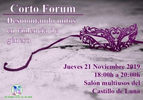 Para hoy jueves día 21, está prevista la celebración del "Corto Fórum: Desmontando mitos en violencia de género" donde a través de distintos cortos y de una manera amena, se desmontarán todos los mitos que rodean a la violencia de género. Este se llevará a cabo de 18.00 a 20.00 horas en el salón multiusos del Castillo de Luna. El acceso es libre.