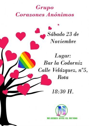 Para el sábado día 23 de noviembre, se celebrará la primera reunión del proyecto "Grupo de Corazones Anónimos" que irá enfocado a crear un espacio donde encontrarse seguro para hablar de los sentimientos y situaciones con el fin de aprender y encontrar apoyo en el ámbito sentimental. Esta primera reunión se llevará a cabo en el bar "La Codorniz", en la calle Velázquez, 5, a las 18.30 horas.