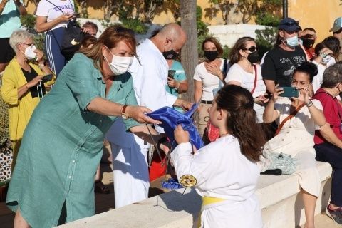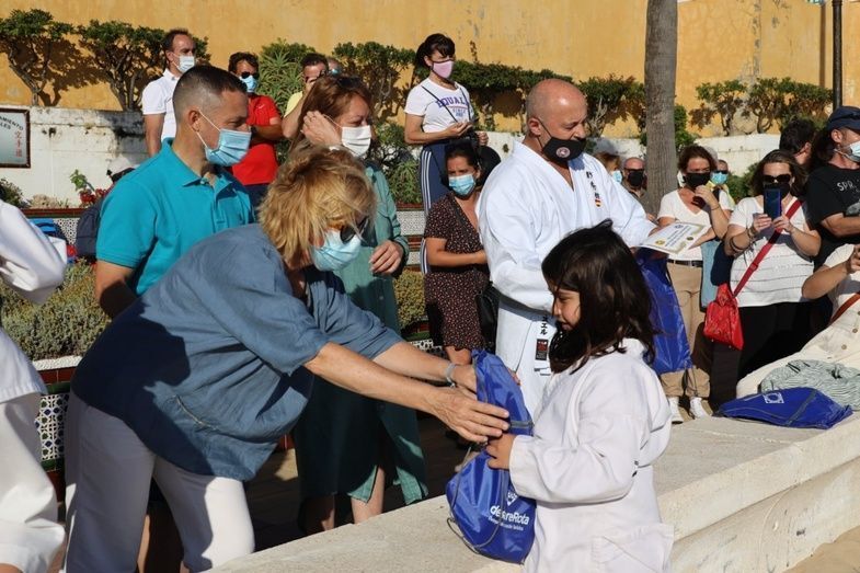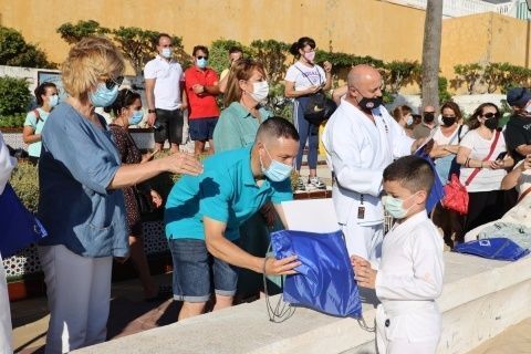 La cita se llevaba a cabo una vez finalizadas las clases de kárate que se han venido desarrollando a lo largo de todo el curso atendiendo las recomendaciones, medidas y normas relativas al Covid, en la explanada situada al aire libre frente a la entrada del Centro Deportivo "José Pino Mengual Pepín", donde habitualmente se llevan a cabo estas clases que cuentan con la colaboración de la delegación municipal de Deportes.