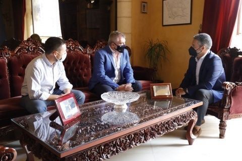 Esta mañana, el alcalde de Rota, Javier Ruiz, acompañado por el delegado de Deportes, José Antonio Medina, ha recibido en el Palacio Municipal Castillo de Luna al presidente del Cádiz C.F., Manuel Vizcaíno.
