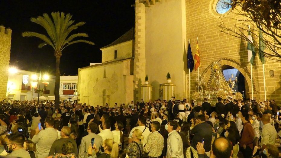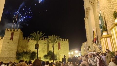 Con la virgen en el dintel de la puerta de la iglesia, desde la azotea del Castillo de Luna comenzaba el lanzamiento de cohetes y fuegos artificiales para despedir un 7 de octubre que ha sido especial y en el que los roteños se han echado a la calle para arropar a la virgen en su día.