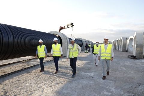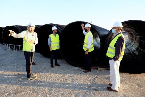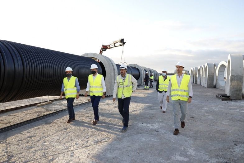 En esta fase del proyecto, la draga trabaja en el mar para la colocación del futuro emisario submarino, una vez que se ha construido la arqueta principal de desbaste que va a permitir retener toda la parte sólida en suspensión en las conducciones de saneamiento, de manera que el emisario tan solo lleve al mar las aguas pluviales. Y el siguiente paso será el traslado de la larga tubería cuyo montaje, esta mañana han presenciado el alcalde de Rota, Javier Ruiz, el delegado de Servicios Municipales, Jesús López Verano, y algunos técnicos del Ayuntamiento de Rota que se han trasladado a El Puerto de Santa María. Allí han podido ver in situ el procedimiento de montaje de la conducción del desagüe que corresponde a la obra en la calle Écija.