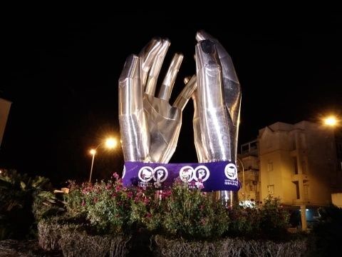 Varios mensajes de repulsa contra la violencia de género han aparecido en la jornada de este jueves, 25 de noviembre, en distintas zonas de Rota. Algunos de ellos, han sido colocados por parte del Colectivo Antifascista de Rota, como un gran lazo morado en la rotonda de "Las Manos", para visibilizar esta fecha en la que se conmemora el Día Internacional de Lucha contra la Violencia de Género, aportando su granito de arena con esta acción reivindicativa.