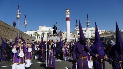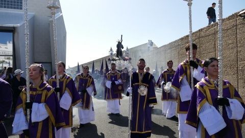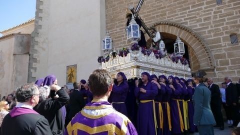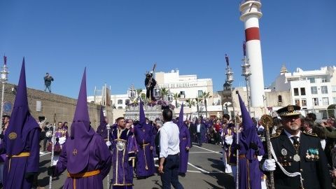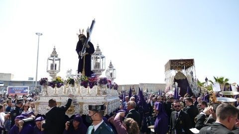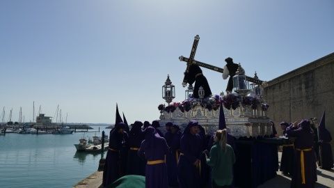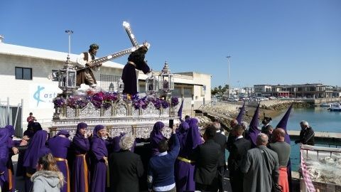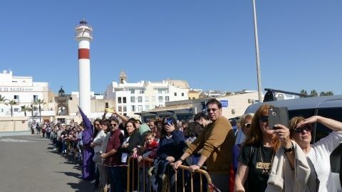 Con un sol que apretaba cada vez más hasta llegar a temperaturas veraniegas en la mañana de este Viernes Santo, Jesús no tenía impedimento para bajar hasta el muelle pesquero. Lo ha hecho sobre las once y media de la mañana para bendecir el mar y a quienes se ganan la vida trabajando en él. Con el cura párroco, director espiritual de la hermandad, José Arjona Gil, se ha rezado un padrenuestro al filo del muelle donde se podían ver los barcos pesqueros. Un tramo, el que va desde el faro hasta el muelle, que también ha estado lleno de gente ya que era la recta final de una Madrugá plena que ha cambiado algunos detalles porque en ese aire de nuevos tiempos que la junta de gobierno elegida quiere ir introduciendo, esta mañana se ha vivido otro momento único, ya que el paso de palio de la Amargura también se ha acercado hasta la puerta del muelle. Aunque la virgen no ha entrado, se ha cruzado con Jesús Nazareno en el inicio de la avenida San Juan de Puerto Rico, donde juntos, uno detrás del otro, han vuelto a enfilar, bajo un sol que empezaba a ser sofocante, la plaza Bartolomé Pérez.