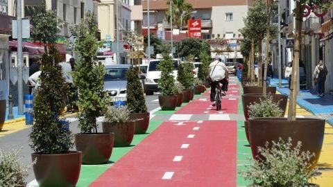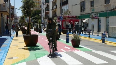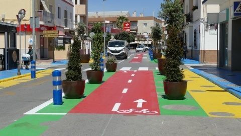 Hoy, con todas las señalizaciones horizontales pintadas, como pasos de cebra, delimitación del carril bici y otras señales, se podían ver también los grandes macetones colocados a los márgenes del carril bici, que ahora discurre por el centro de la calzada, y al lado, el carril en único sentido que se ha dejado para los vehículos a motor desde la calle Huelva a la avenida San Fernando.